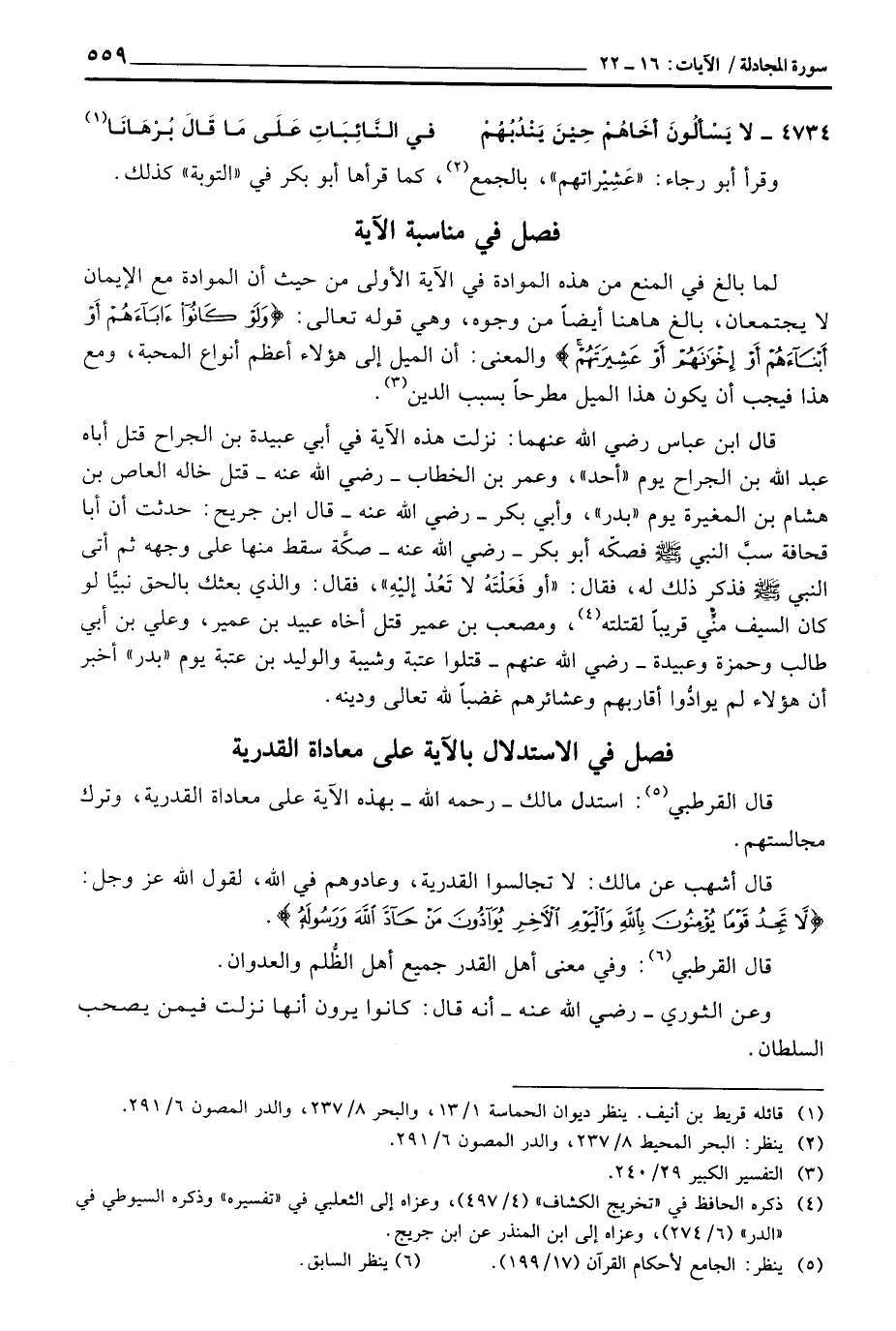 «حدثت أن أبا قحافة سبَّ النبي صَلَّى اللَّهُ عَلَيْهِ وَسَلَّم َ فصكّه أبو بكر - رَضِيَ اللَّهُ عَنْه - صكَّة سقط منها على وجهه ثم أتى النبي صَلَّى اللَّهُ عَلَيْهِ وَسَلَّم َ فذكر ذلك له، فقال:» أو فَعَلْتَهُ لا تَعُدْ إليْهِ «، فقال: والذي بعثك بالحق نبيًّا لو كان السيف منِّي قريباً لقتلته» ، ومصعب بن عمير قتل أخاه عبيد بن عمير، وعلي بن أبي طالب وحمزة وعبيدة - رَضِيَ اللَّهُ عَنْهم - قتلوا عتبة وشيبة والوليد بن عتبة يوم «بدر» أخبر أن هؤلاء لم يوادُّوا أقاربهم وعشائرهم غضباً لله تعالى ودينه.