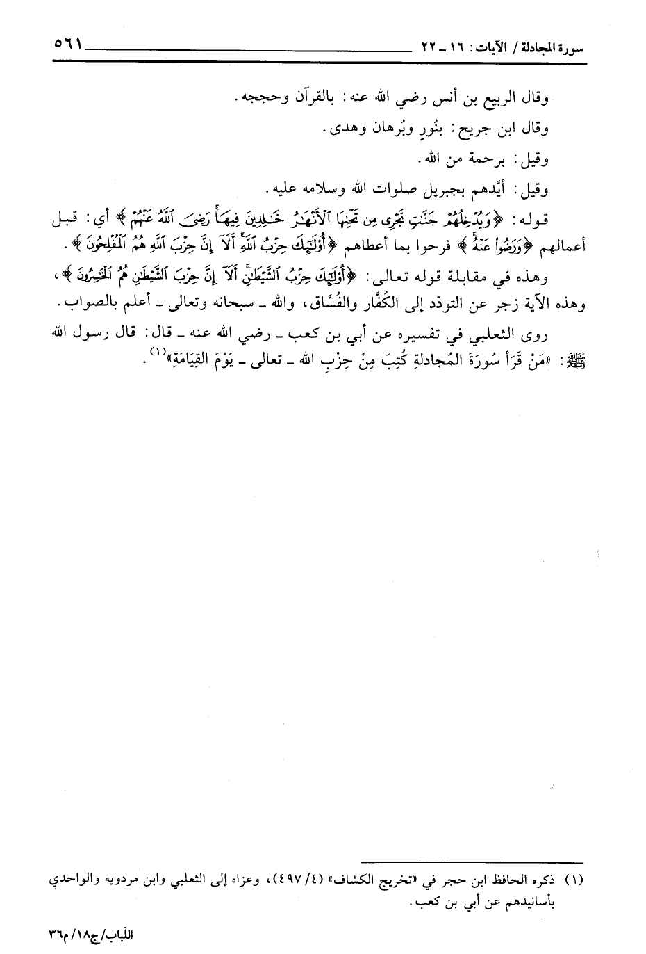 روى الثعلبي في تفسيره عن أبي بن كعب - رَضِيَ اللَّهُ عَنْه - قال: قال رسول الله صَلَّى اللَّهُ عَلَيْهِ وَسَلَّم َ: «مَنْ قَرَأ سُورَةَ المُجادلةِ كُتِبَ مِنْ حِزْبِ الله - تعالى - يَوْمَ القِيَامَةِ» .