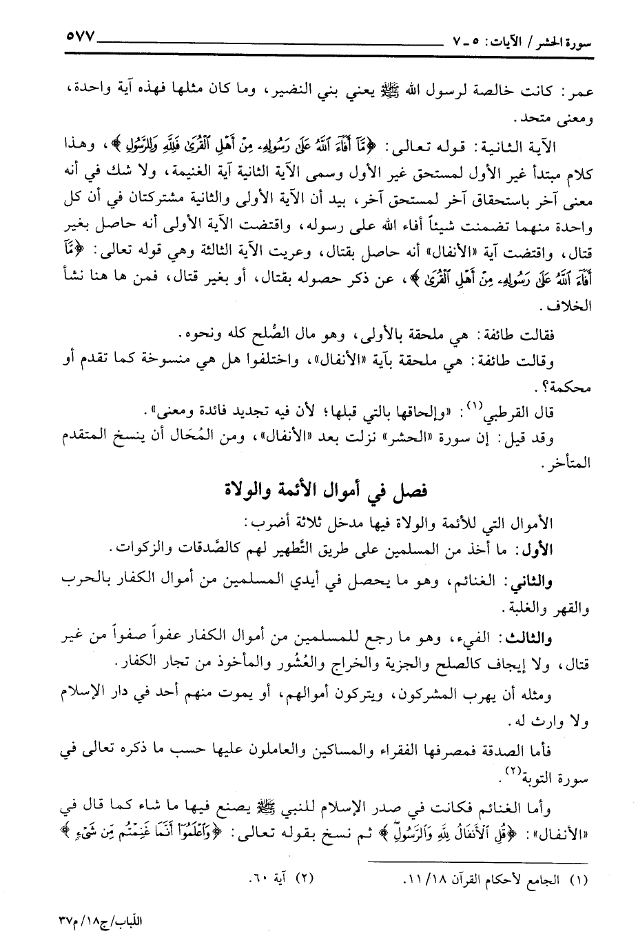 الآية الثانية: قوله تعالى: {مَّآ أَفَآءَ الله على رَسُولِهِ مِنْ أَهْلِ القرى فَلِلَّهِ وَلِلرَّسُولِ} ، وهذا كلام مبتدأ غير الأول لمستحق غير الأول وسمى الآية الثانية آية الغنيمة، ولا شك في أنه معنى آخر باستحقاق آخر لمستحق آخر، بيد أن الآية الأولى والثانية مشتركتان في أن كل واحدة منهما تضمنت شيئاً أفاء الله على رسوله، واقتضت الآية الأولى أنه حاصل بغير قتال، واقتضت آية «الأنفال» أنه حاصل بقتال، وعريت الآية الثالثة وهي قوله تعالى: {مَّآ أَفَآءَ الله على رَسُولِهِ مِنْ أَهْلِ القرى} ، عن ذكر حصوله بقتال، أو بغير قتال، فمن ها هنا نشأ الخلاف.