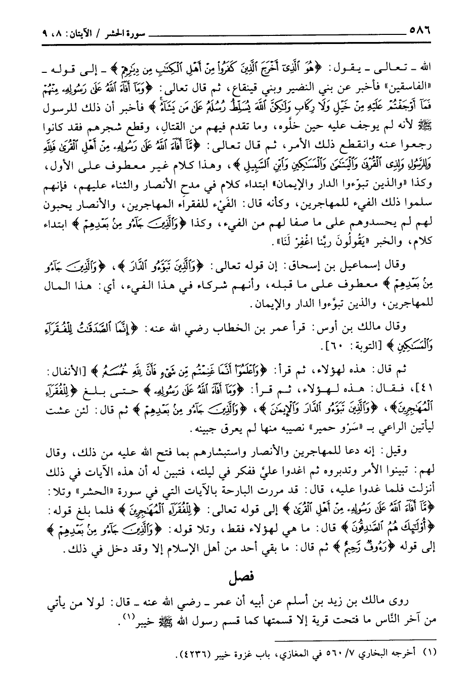 الله - تعالى - يقول: {هُوَ الذي أَخْرَجَ الذين كَفَرُواْ مِنْ أَهْلِ الكتاب مِن دِيَارِهِمْ} [الحشر: 2]- إلى قوله - «الفاسقين» فأخبر عن بني النضير وبني قينقاع، ثم قال تعالى: {وَمَآ أَفَآءَ الله على رَسُولِهِ مِنْهُمْ فَمَآ أَوْجَفْتُمْ عَلَيْهِ مِنْ خَيْلٍ وَلاَ رِكَابٍ ولكن الله يُسَلِّطُ رُسُلَهُ على مَن يَشَآءُ} [الحشر: 6] فأخبر أن ذلك للرسول صَلَّى اللَّهُ عَلَيْهِ وَسَلَّم َ لأنه لم يوجف عليه حين خلَّوه، وما تقدم فيهم من القتالِ، وقطع شجرهم فقد كانوا رجعوا عنه وانقطع ذلك الأمر، ثم قال تعالى: {مَّآ أَفَآءَ الله على رَسُولِهِ مِنْ أَهْلِ القرى فَلِلَّهِ وَلِلرَّسُولِ وَلِذِي القربى واليتامى والمساكين وابن السبيل} [الحشر: 7] ، وهذا كلام غير معطوف على الأول، وكذا {والذين تبوّءوا الدار والإيمان} ابتداء كلام في مدحِ الأنصار والثناء عليهم، فإنهم سلموا ذلك الفيء للمهاجرين، وكأنه قال: الفَيْء للفقراء المهاجرين، والأنصار يحبون لهم لم يحسدوهم على ما صفا لهم من الفيء، وكذا {والذين جَآءُو مِن بَعْدِهِمْ} [الحشر: 10] ابتداء كلام، والخبر {يَقُولُونَ رَبَّنَا اغفر لَنَا} [الحشر: 10] .