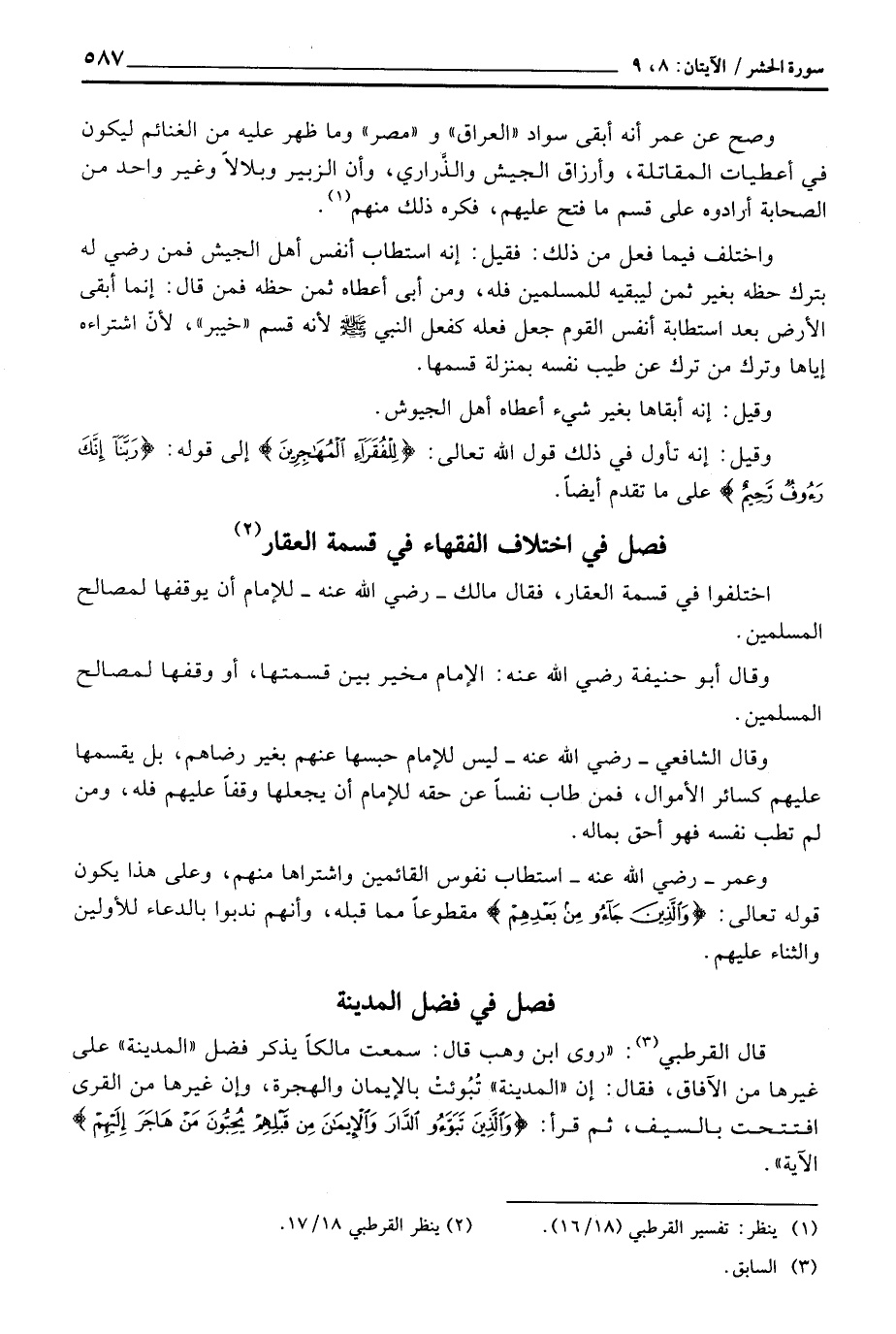قال القرطبي: «روى ابن وهب قال: سمعت مالكاً يذكر فضل» المدينة «على غيرها من الآفاق، فقال: إن» المدينة «تُبُوئتْ بالإيمان والهجرة، وإن غيرها من القرى افتتحت بالسيف، ثم قرأ: {والذين تَبَوَّءُو الدار والإيمان مِن قَبْلِهِمْ يُحِبُّونَ مَنْ هَاجَرَ إِلَيْهِمْ} الآية» .
