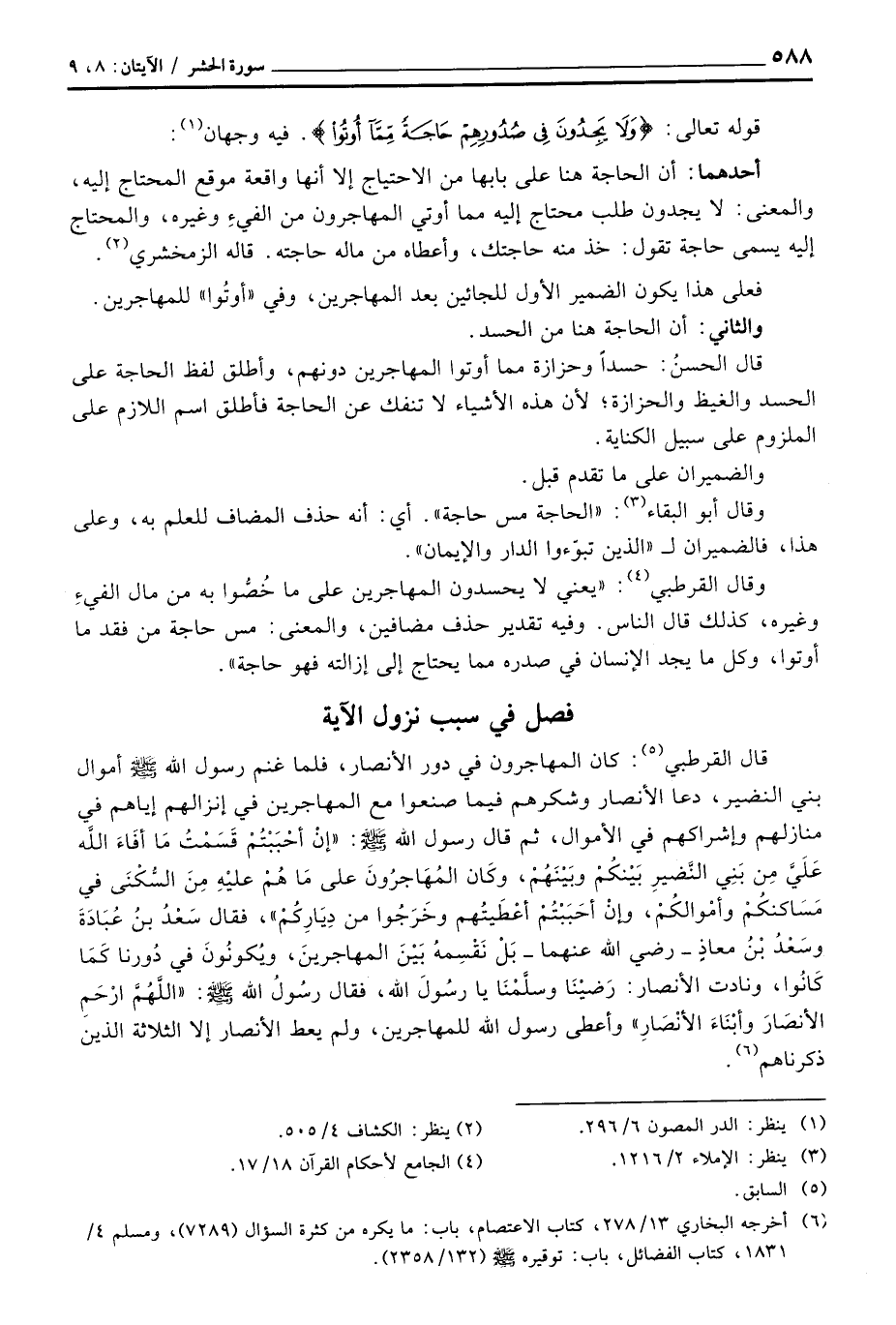 وقال القرطبي: «يعني لا يحسدون المهاجرين على ما خُصُّوا به من مال الفيءِ وغيره، كذلك قال الناس. وفيه تقدير حذف مضافين، والمعنى: مس حاجة من فقد ما أوتوا، وكل ما يجد الإنسان في صدره مما يحتاج إلى إزالته فهو حاجة» .