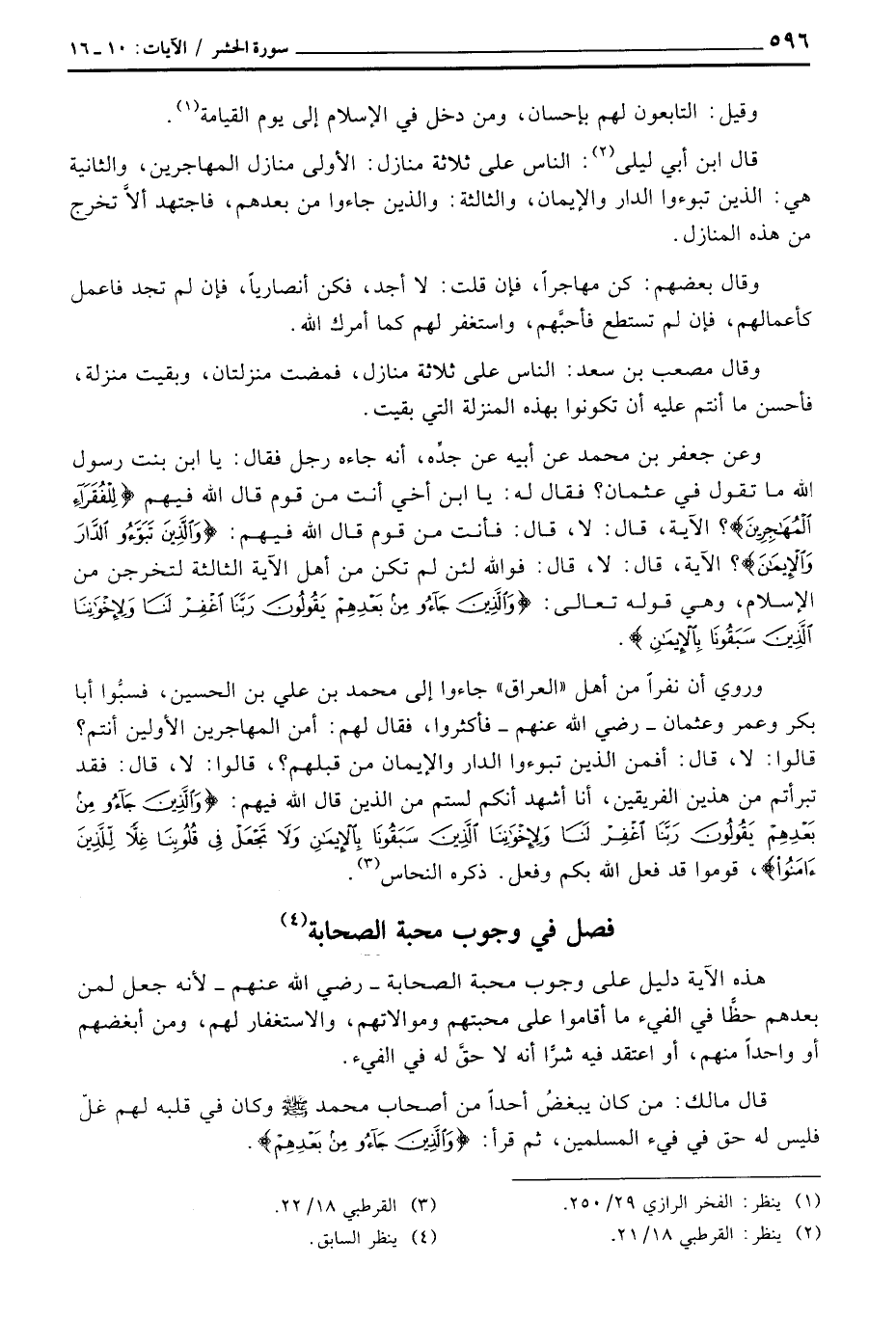 هذه الآية دليل على وجوب محبة الصحابة - رَضِيَ اللَّهُ عَنْهم - لأنه جعل لمن بعدهم حظًّا في الفيء ما أقاموا على محبتهم وموالاتهم، والاستغفار لهم، ومن أبغضهم أو واحداً منهم، أو اعتقد فيه شرًّا أنه لا حقَّ له في الفيء.