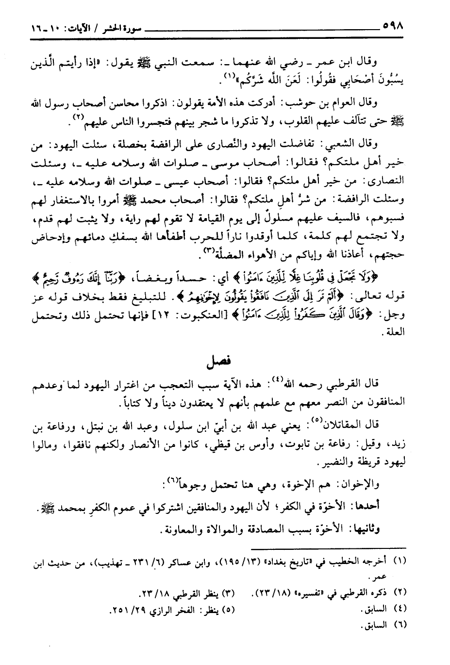 وقال الشعبي: تفاضلت اليهود والنَّصارى على الرافضة بخصلة، سئلت اليهود: من خير أهل ملتكم؟ فقالوا: أصحاب موسى - صلوات الله وسلامه عليه -، وسئلت النصارى: من خير أهل ملتكم؟ فقالوا: أصحاب عيسى - صلوات الله وسلامه عليه -، وسئلت الرافضة، من شرُّ أهلِ ملتكم؟ فقالوا: أصحاب محمد صَلَّى اللَّهُ عَلَيْهِ وَسَلَّم َ أمروا بالاستغفار لهم فسبوهم، فالسيف عليهم مسلولٌ إلى يوم القيامة لا تقوم لهم راية، ولا يثبت لهم قدم، ولا تجتمع لهم كلمة، كلما أوقدوا ناراً للحرب أطفأها الله بسفكِ دمائهم وإدحاض حجتهم، أعاذنا الله وإياكم من الأهواء المضلَّة.