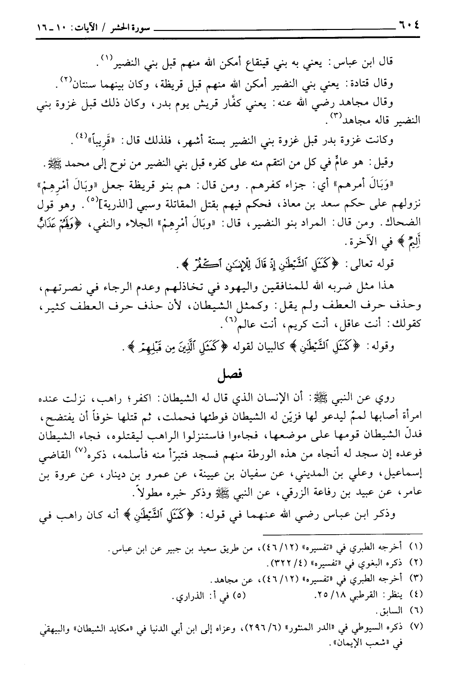هذا مثل ضربه الله للمنافقين واليهود في تخاذلهم وعدم الرجاء في نصرتهم، وحذف حرف العطف ولم يقل: وكمثل الشيطان، لأن حذف حرف العطف كثير، كقولك: أنت عاقل، أنت كريم، أنت عالم.