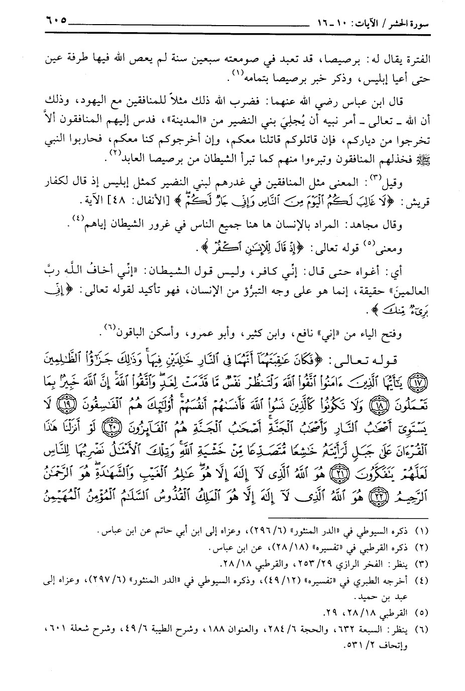 قال ابن عباس رَضِيَ اللَّهُ عَنْهما: فضرب الله ذلك مثلاً للمنافقين مع اليهود، وذلك أن الله - تعالى - أمر نبيه أن يُجلِيَ بني النضير من «المدينة» ، فدس إليهم المنافقون ألاَّ تخرجوا من دياركم، فإن قاتلوكم قاتلنا معكم، وإن أخرجوكم كنا معكم، فحاربوا النبي صَلَّى اللَّهُ عَلَيْهِ وَسَلَّم َ فخذلهم المنافقون وتبرءوا منهم كما تبرأ الشيطان من برصيصا العابد.