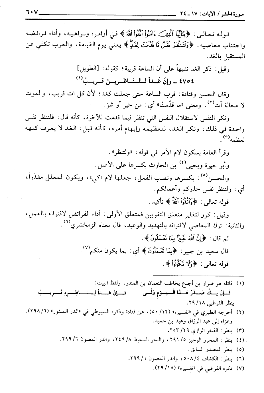 4754 - وإنَّ غَداً للنَّاظرينَ قريبُ ... وقال الحسن وقتادة: قرب الساعة حتى جعلت كغد؛ لأن كل آت قريب، والموت لا محالة آت. ومعنى «ما قدَّمتْ» أي: من خير أو شرّ.