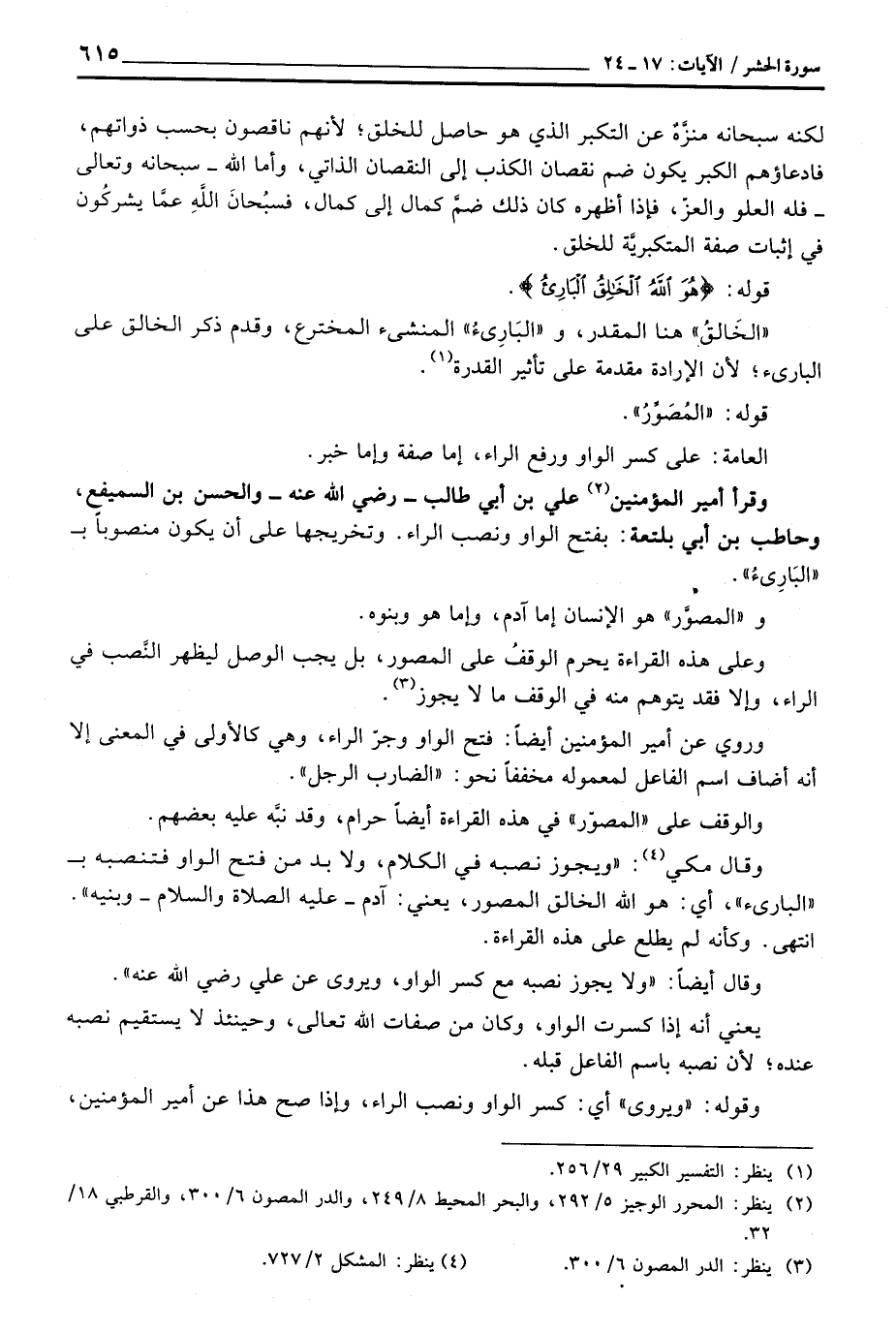 وقال مكي: «ويجوز نصبه في الكلام، ولا بد من فتح الواو فتنصبه ب» البارىء «، أي: هو الله الخالق المصور، يعني: آدم - عَلَيْهِ الصَّلَاة وَالسَّلَام ُ - وبنيه» . انتهى. وكأنه لم يطلع على هذه القراءة.