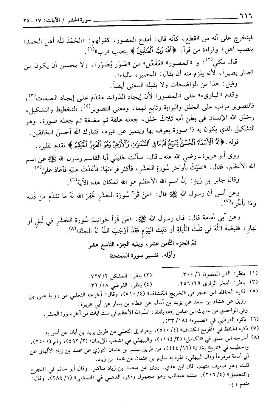 «سألت خليلي أبا القاسم رسول الله صَلَّى اللَّهُ عَلَيْهِ وَسَلَّم َ عن اسم الله الأعظم، فقال:» عليْكَ بأواخر سُورةِ الحَشْرِ، فأكثر قراءتهَا «فأعَدْتُ عليْهِ فأعَادَ عليَّ» .
