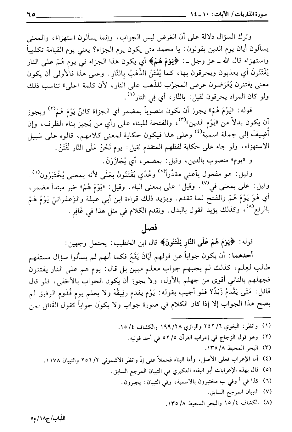 قوله: «يَوْمَ هُمْ» يجوز أن يكون منصوباً بمضمر أي الجزاءُ كائنٌ يَوْمَ هُمْ ويجوز أن يكون بدلاً من «يَوْم الدين» ، والفتحة للبناء على رأي من يُجيز بناء الظرف، وإن أُضِيفَ إلى جملة اسمية وعلى هذا فيكون حكاية لمعنى كلامهم، قالوه على سَبيل الاستهزاء، ولو جاء على حكاية لفظهم المتقدم لقيل: يوم نَحْنُ عَلَى النَّار نُفْتَنُ.
