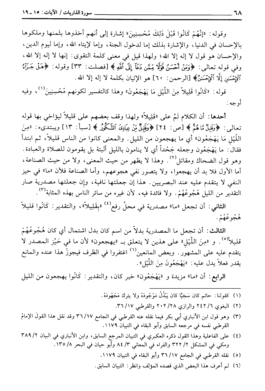 أحدها: أن الكلام تَمَّ على «قَلِيلاً» ولهذا وقف بعضهم على قليلاً ليؤاخي بها قوله تعالى: {وَقَلِيلٌ مَّا هُمْ} [ص: 24] {وَقَلِيلٌ مِّنْ عِبَادِيَ الشكور} [سبأ: 13] ويبتدئ: {مِّن الليل مَا يَهْجَعُونَ} أي ما يهجعون من الليل. والمعنى كانوا من الناس قليلاً، ثم ابتدأ فقال: ما يَهْجَعُون وجعله جَحْداً أي لا ينامون بالليل ألبتة يقومون للصلاة والعبادة. وهو قول الضحاك ومقاتل. وهذا لا يظهر من حيث المعنى، ولا من حيث الصناعة، أما الأول فلا بد أن يهجعوا، ولا يتصور نفي هجوعهم، وأما الصناعة فلأن «ما» في حيز النفي لا يتقدم عليه عند البصريين. هذا إن جعلتها نافية، وإِن جعلتها مصدرية صار التقدير من الليل هُجُوعُهُمْ. ولا فائدة فيه، لأن غيره من سائر الناس بهذه المثابة.