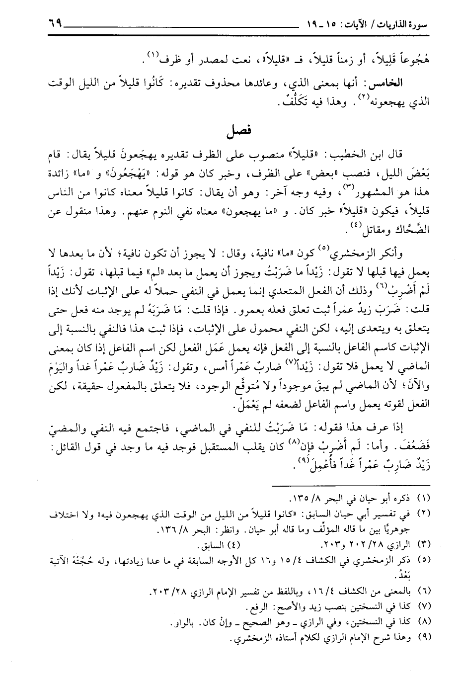 قال ابن الخطيب: «قليلاً» منصوب على الظرف تقديره يهجَعونَ قليلاً يقال: قام بَعْضَ الليل، فنصب «بعض» على الظرف، وخبر كان هو قوله: «يَهْجَعُونَ» و «ما» زائدة هذا منقول عن الضَّحَّاك ومقاتل.