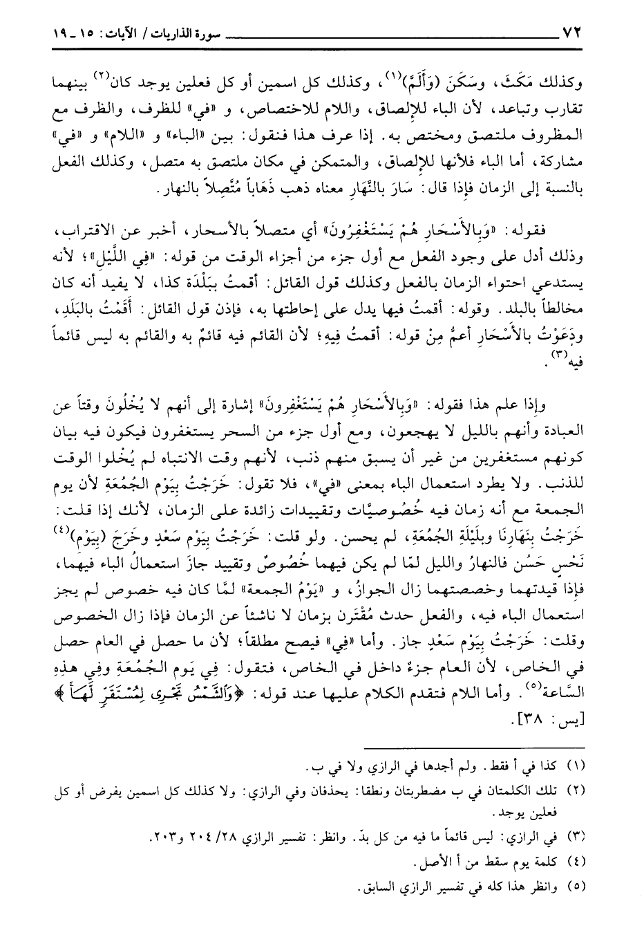 وإِذا علم هذا فقوله: {وبالأسحار هُمْ يَسْتَغْفِرُونَ} إشارة إلى أنهم لا يُخْلُونَ وقتاً عن العبادة وأنهم بالليل لا يهجعون، ومع أول جزء من السحر يتسغفرون فيكون فيه بيان كونهم مستغفرين من غير أن يسبق منهم ذنب، لأنهم وقت الانتباه لم يُخْلوا الوقت للذنب. ولا يطرد استعمال الباء بمعنى «في» ، فلا تقول: خَرَجْتُ بِيَوْم الجُمُعَةِ لأن يوم الجمعة مع أنه زمان فيه خُصُوصيَّات وتقييدات زائدة على الزمان، لأنك إذا قلت: خَرَجْتُ بِنَهَارِنَا وبلَيْلَةِ الجُمُعَةِ، لم يحسن. ولو قلت: خَرَجْتُ بِيَوْم سَعْدٍ وخَرَجَ (بِيَوْمِ) نَحْسٍ حَسُن فالنهارُ والليل لمّا لم يكن فيهما خُصُوصٌ وتقييد جازَ استعمالُ الباء فيهما، فإِذا قيدتهما وخصصتهما زال الجوازُ، و «يَوْمُ الجمعة» لمَّا كان فيه خصوص لم يجز وقلت: خَرَجْتُ بِيَوْم سَعْدٍ جاز. وأما «فِي» فيصح مطلقاً؛ لأن ما حصل في العام حصل في الخاص، لأن العام جزءٌ داخل في الخاص، فتقول: فِي يَوْمِ الجُمُعَةِ وفِي هذِهِ السَّاعة. وأما اللام فتقدم الكلام عليها عند قوله: {والشمس تَجْرِي لِمُسْتَقَرٍّ لَّهَا} [يس: 38] .