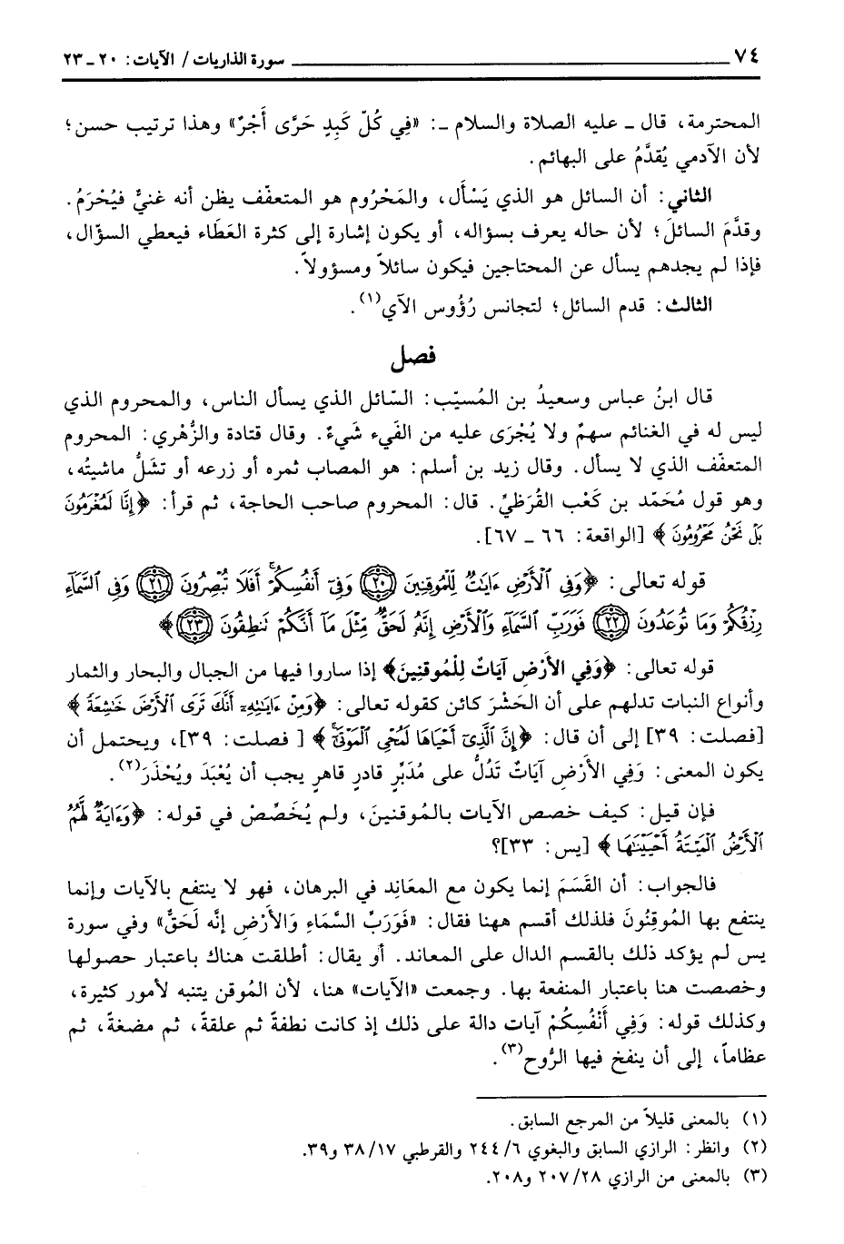 الثاني: أن السائل هو الذي يَسْأَل، والمَحْرُوم هو المتعفّف يظن أنه غنيٌّ فيُحْرَمُ. وقدَّمَ السائلَ؛ لأن حاله يعرف بسؤاله، أو يكون إشارة إلى كثرة العَطَاء فيعطي السؤّال، فإذا لم يجدهم يسأل عن المحتاجين فيكون سائلاً ومسؤولاً.