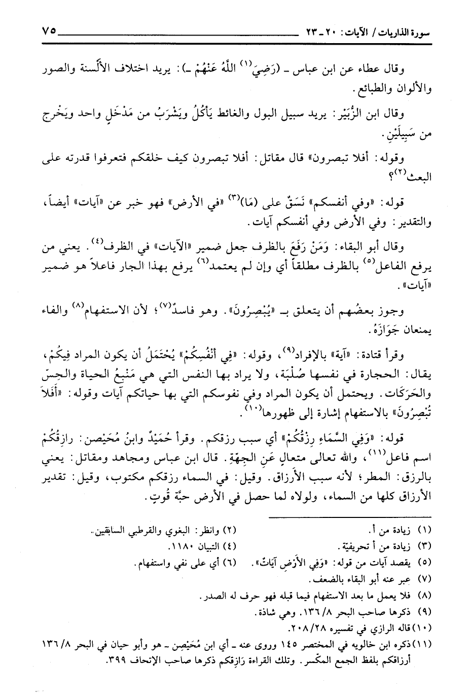 وقرأ قتادة:» آية «بالإفراد، وقوله:» فِي أنْفُسِكُمْ «يُحْتَمَلُ أن يكون المراد فِيكُمْ، يقال: الحجارة في نفسها صُلْبَة، ولا يراد بها النفس التي هي مَنْبعُ الحياة والحِسّ والحَرَكَات. ويحتمل أن يكون المراد وفي نفوسكم التي بها حياتكم آيات وقوله:» أَفَلاَ تُبْصِرُونَ «بالاستفهام إشارة إلى ظهورها.
