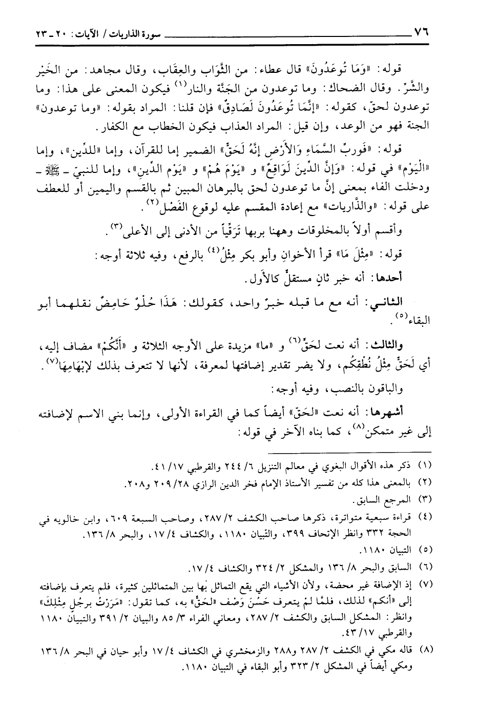 والثالث: أنه نعت لحَقٍّ و «ما» مزيدة على الأوجه الثلاثة و «أَنَّكُمْ» مضاف إليه، أي لَحَقٌّ مِثْلُ نُطْقِكُم، ولا يضر تقدير إضافتها لمعرفة، لأنها لا تتعرف بذلك لإبْهَامِهَا.
