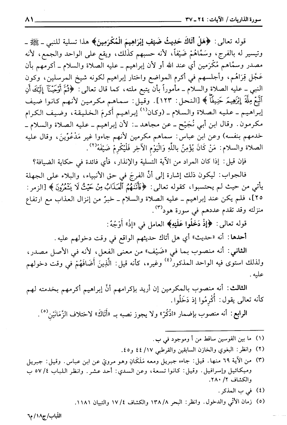 قوله تعالى: {هَلْ أَتَاكَ حَدِيثُ ضَيْفِ إِبْرَاهِيمَ المكرمين} هذا تسلية للنبي - صَلَّى اللَّهُ عَلَيْهِ وَسَلَّم َ - وتيسير له بالفرج، وسَمَّاهُمْ ضَيْفاً، لأنه حسبهم كذَلك، ويقع على الواحد والجمع، لأنه مصدر وسمَّاهم مُكْرَمين أي عند الله أو لأن إبراهيم - عَلَيْهِ الصَّلَاة وَالسَّلَام ُ - أكرمهم بأن عَجَّل قِرَاهُم، وأجلسهم في أكرم المواضع واختار إبراهيم لكونه شيخ المرسلين، وكون النبي - عَلَيْهِ الصَّلَاة وَالسَّلَام ُ - مأموراً بأن يتبع ملته، كما قال تعالى: {ثُمَّ أَوْحَيْنَآ إِلَيْكَ أَنِ اتبع مِلَّةَ إِبْرَاهِيمَ حَنِيفاً} [النحل: 123] . وقيل: سماهم مكرمين لأنهم كانوا ضيف إبراهيم - عَلَيْهِ الصَّلَاة وَالسَّلَام ُ - (وكان إبراهيم أَكرمَ الخليقة، وضيف الكرام مكرمون. وقال ابن أبي نُجَيْح - عن مجاهد -: لأن إبراهيم - عَلَيْهِ الصَّلَاة وَالسَّلَام ُ - خدمهم بنفسه) وعن ابن عباس: سماهم مكرمين لأنهم جاءوا غير مَدْعُوِّينَ، وقال عَلَيْهِ الصَّلَاة وَالسَّلَام ُ: «مَنْ كَانَ يُؤْمِنُ باللَّهِ وَالْيَوْمِ الآخِر فَلْيُكْرِمْ ضَيْفَهُ» .