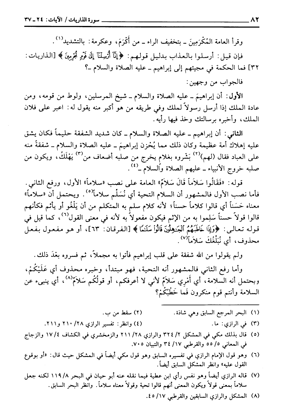 قوله: {فَقَالُواْ سَلاَماً قَالَ سَلاَمٌ} العامة على نصب «سلاماً» الأول، ورفع الثاني. فأما نصب الأول فالمشهور أن السلام التحية أي نُسَلِّم سلاماً. ويحتمل أن «سلاماً» معناه حَسَناً أي قالوا كلاماً حسناً؛ لأنه كلام سلم به المتكلم من أن يَلْغُو أو يأثم فكأنهم قالوا قولاً حسناً سَلِموا به من الإثم فيكون مفعولاً به لأنه في معنى القول، كما قيل في قوله تعالى: {وَإِذَا خَاطَبَهُمُ الجَاهِلُونَ قَالُواْ سَلاَماً} [الفرقان: 63] ، أو هو مفعول بفعل محذوف، أي نُبَلِّغُكَ سَلاَماً.