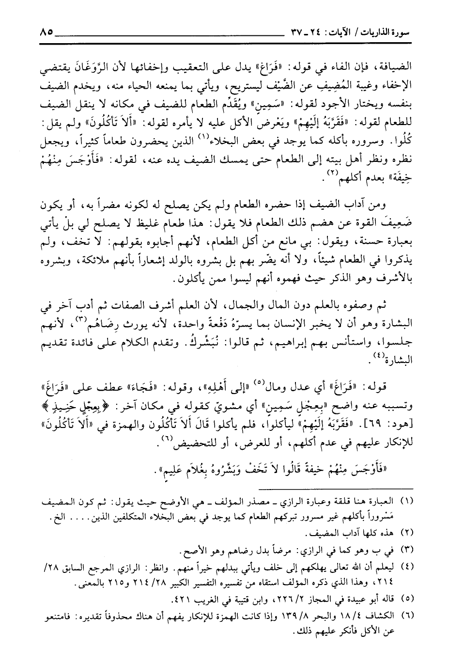 الضيافة، فإن الفاء في قوله: «فَرَاغ» يدل على التعقيب وإخفائها لأن الرَّوَغَانَ يقتضي الإخفاء وغيبة المُضِيفِ عن الضَّيْف ليستريح، ويأتي بما يمنعه الحياء منه، ويخدم الضيف بنفسه ويختار الأجود لقوله: «سَمِينٍ» ويُقَدِّم الطعام للضيف في مكانه لا ينقل الضيف للطعام لقوله: «فَقَرَّبَهُ إلَيْهِمْ» ويَعْرض الأكل عليه لا يأمره لقوله: «أَلاَ تَأْكُلُونَ» ولم يقل: كُلُوا. وسروره بأكله كما يوجد في بعض البخلاء الذين يحضرون طعاماً كثيراً، ويجعل نظره ونظر أهل بيته إلى الطعام حتى يمسك الضيف يده عنه، لقوله: {فَأَوْجَسَ مِنْهُمْ خِيفَةً} بعدم أكلهم.