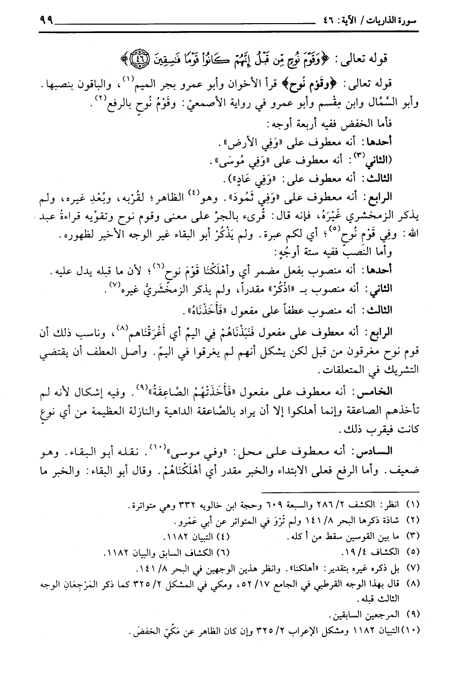 الرابع: أنه معطوف على «وَفِي ثَمُودَ» . وهو الظاهر؛ لقُرْبه، وبُعْدِ غيره، ولم يذكر الزمخشري غَيْرَهُ، فإنه قال: قُرئ بالجرِّ على معنى وقوم نوح وتقوِّيه قراءةُ عبد الله: وفِي قَوْمِ نوحٍ؛ أي لكم عبرة. ولم يَذْكُرْ أبو البقاء غير الوجه الأخير لظهوره.