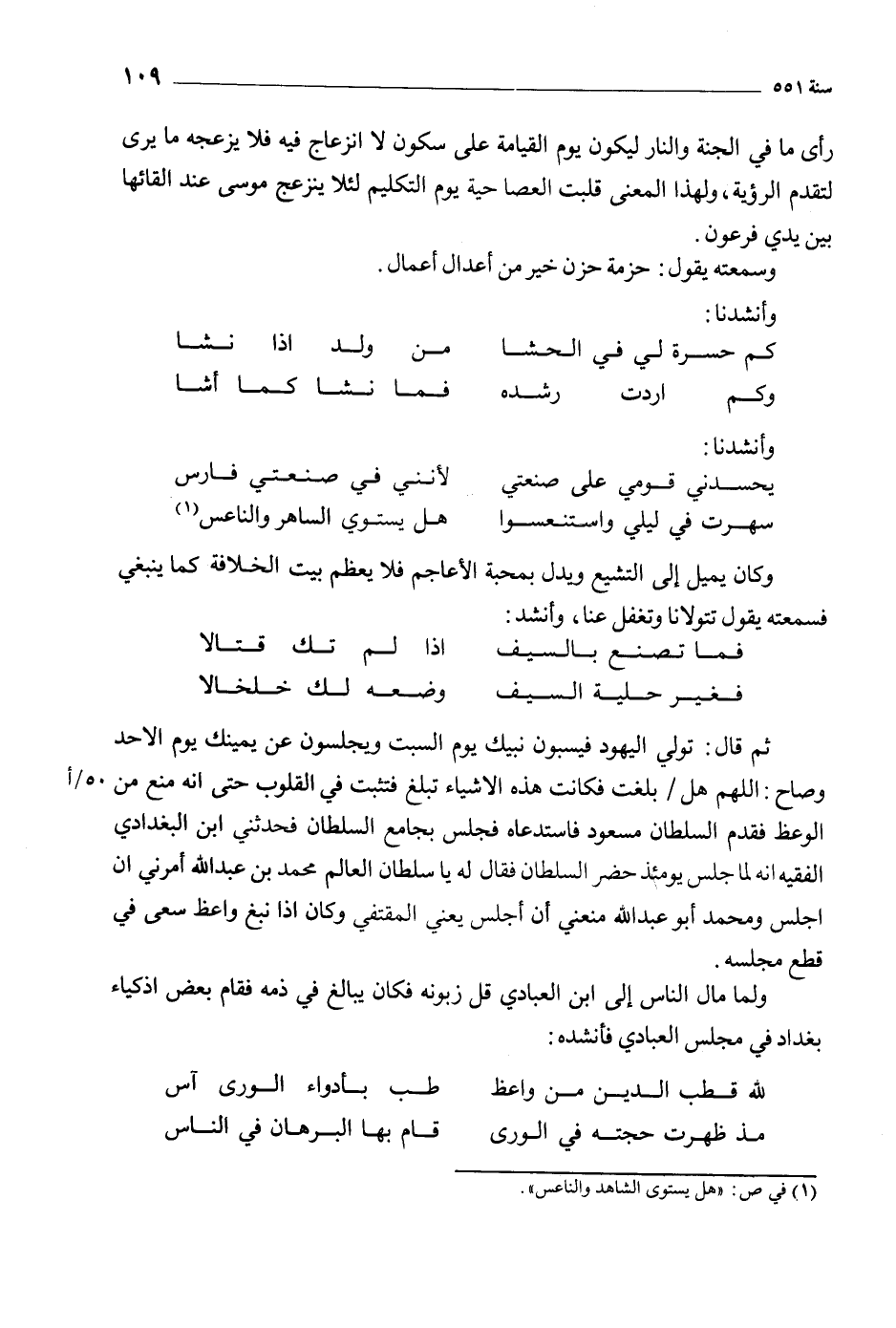 ثم قال: تولى اليهود فيسبون نبيك يوم السبت ويجلسون عن يمينك يوم الأحد وصاح: اللَّهمّ هل/ بلغت فكانت هذه الأشياء تبلغ فتثبت في القلوب حتى انه منع من 50/ أالوعظ فقدم السلطان مسعود فاستدعاه فجلس بجامع السلطان فحدثني ابن البغدادي الفقيه أنه لما جلس يومئذ حضر السلطان فقال له يا سلطان العالم محمد بن عبد الله أمرني أن أجلس ومحمد أبو عبد الله منعني أن أجلس يعني المقتفي وكان إذا نبغ واعظ سعى في قطع مجلسه.