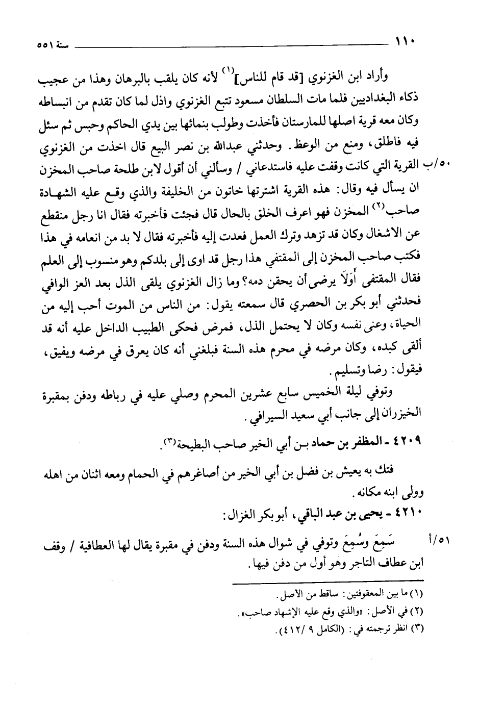 وأراد ابن الغزنوي [قد قام للناس] [1] لأنه كان يلقب بالبرهان وهذا من عجيب ذكاء البغداديين فلما مات السلطان مسعود تتبع الغزنوي وأذل لما كان تقدم من انبساطه وكان معه قرية أصلها للمارستان فأخذت وطولب بنمائها بين يدي الحاكم وحبس ثم سئل فيه فاطلق، ومنع من الوعظ. وحدثني عبد الله بن نصر البيع قال أخذت من الغزنوي 50/ ب القرية التي كانت وقفت عليه فاستدعاني/ وسألني أن أقول لابن طلحة صاحب المخزن أن يسأل فيه وقال: هذه القرية اشترتها خاتون من الخليفة والذي وقع عليه الشهادة صاحب [2] المخزن فهو أعرف الخلق بالحال قال فجئت فأخبرته فقال أنا رجل منقطع عن الأشغال وكان قد تزهد وترك العمل فعدت إليه فأخبرته فقال لا بد من إنعامه في هذا فكتب صاحب المخزن إلى المقتفي هذا رجل قد أوى إلى بلدكم وهو منسوب إلى العلم فقال المقتفي أولا يرضى أن يحقن دمه؟ وما زال الغزنوي يلقى الذل بعد العز الوافي فحدثني أبو بكر بن الحصري قال سمعته يقول: من الناس من الموت أحب إليه من الحياة، وعني نفسه وكان لا يحتمل الذل، فمرض فحكى الطبيب الداخل عليه أنه قد ألقى كبده، وكان مرضه في محرم هذه السنة فبلغني أنه كان يعرق في مرضه ويفيق، فيقول: رضا وتسليم.