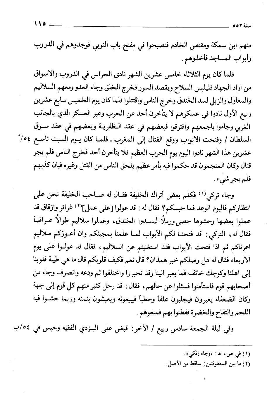 فلما كان يوم الثلاثاء خامس عشرين الشهر نادى الحراس في الدروب والأسواق من أراد الجهاد فليلبس السلاح ويقصد السور فخرج الخلق وجاء العدو ومعهم السلاليم والمعاول والزبل لسد الخندق وخرج الناس واقتتلوا فلما كان يوم الخميس سابع عشرين ربيع الأول نادوا في عسكرهم لا يتأخرن أحد عن الحرب وعبر العسكر الذي بالجانب الغربي وجاءوا باجمعهم وافترقوا فبعضهم في عقد الظفرية وبعضهم في عقد سوق السلطان/ وفتحت الأبواب ووقع القتال إلى المغرب- فلما كان يوم السبت تاسع 54/ أعشرين هذا الشهر نادوا اليوم يوم الحرب العظيم فلا يتأخرن أحد فخرج الناس فلم يجر قتال وكان المنجمون قد حكموا فيه بأمر عظيم يلحق الناس من القتل وغيره فبان كذبهم فلم يجر شيء.