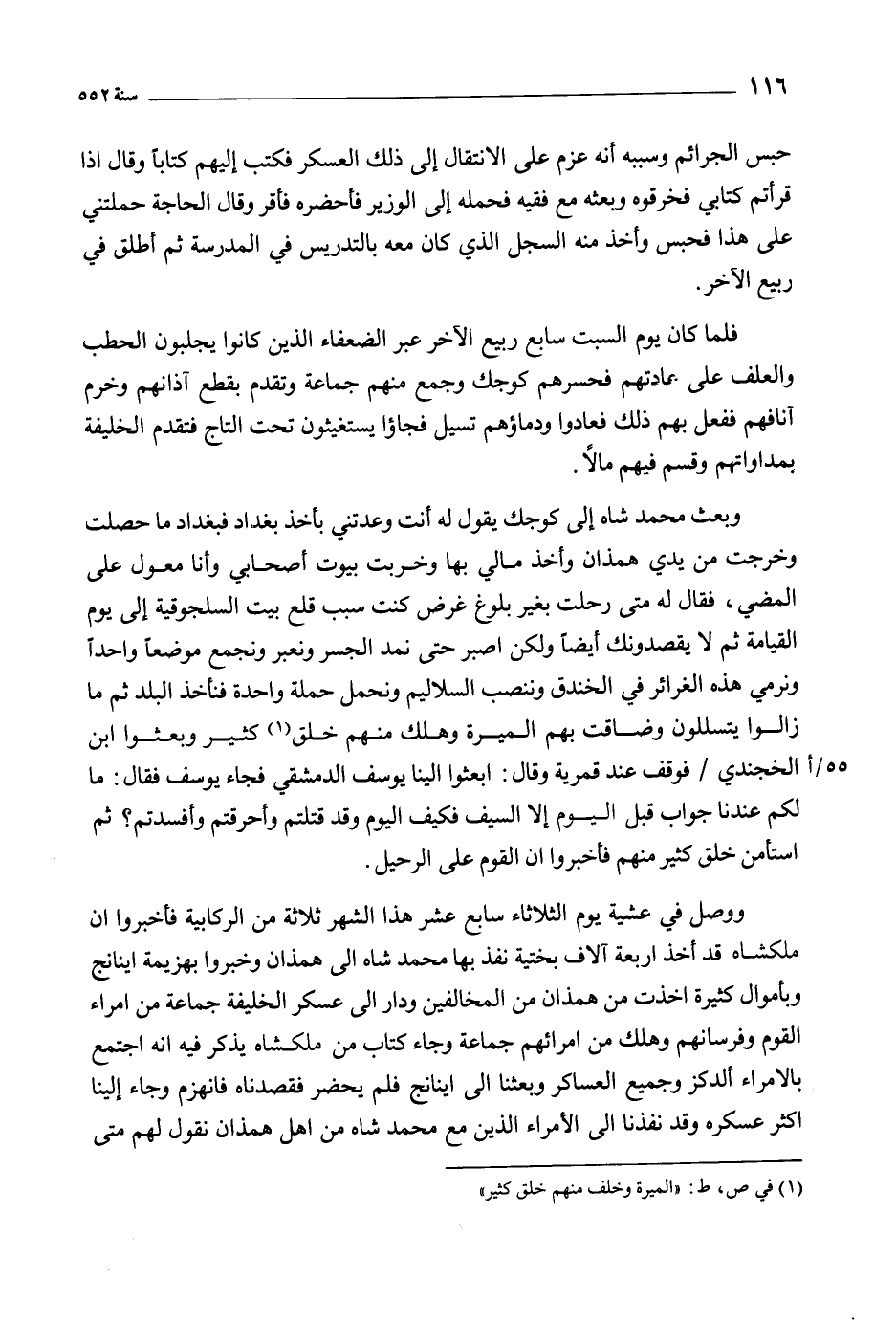 ووصل في عشية يوم الثلاثاء سابع عشر هذا الشهر ثلاثة من الركابية فأخبروا ان ملك شاه قد أخذ أربعة آلاف بختية نفذ بها محمد شاه إلى همذان وخبروا بهزيمة أينانج وبأموال كثيرة أخذت من همذان من المخالفين ودار إلى عسكر الخليفة جماعة من أمراء القوم وفرسانهم وهلك من أمرائهم جماعة وجاء كتاب من ملك شاه يذكر فيه أنه اجتمع بالأمراء ألدكز وجميع العساكر وبعثنا إلى أينانج فلم يحضر فقصدناه فانهزم وجاء إلينا أكثر عسكره وقد نفذنا إلى الأمراء الذين مع محمد شاه من أهل همذان نقول لهم متى