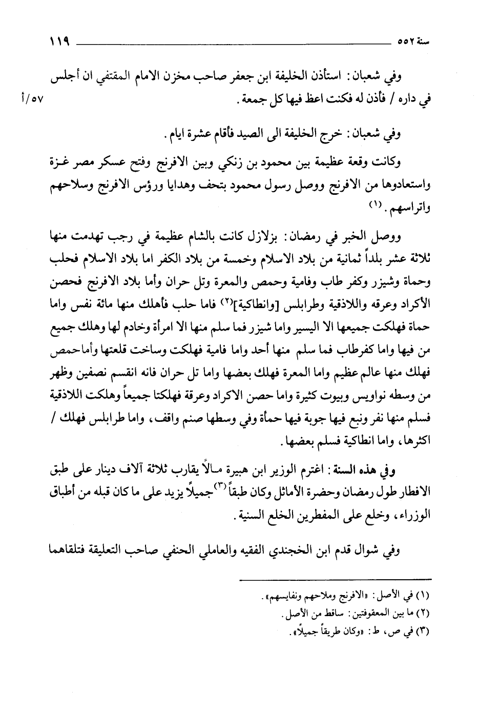 وكانت وقعة عظيمة بين محمود بن زنكي وبين الإفرنج وفتح عسكر مصر غزة واستعادوها من الإفرنج ووصل رسول محمود بتحف وهدايا ورءوس الإفرنج وسلاحهم وأتراسهم. [1] ووصل الخبر في رمضان: بزلازل كانت بالشام عظيمة في رجب تهدمت منها ثلاثة عشر بلدا ثمانية من بلاد الإسلام وخمسة من بلاد الكفر أما بلاد الإسلام فحلب وحماة وشيزر وكفر طاب وفامية وحمص والمعرة وتل حران وأما بلاد الإفرنج فحصن الأكراد وعرقة واللاذقية وطرابلس [وأنطاكية] [2] فأما حلب فأهلك منها مائة نفس وأما حماة فهلكت جميعها إلا اليسير واما شيزر فما سلم منها إلا امرأة وخادم لها وهلك جميع من فيها وأما كفر طاب فما سلم منها أحد وأما فامية فهلكت وساخت قلعتها وأما حمص فهلك منها عالم عظيم وأما المعرة فهلك بعضها وأما تل حران فإنه انقسم نصفين وظهر من وسطه نواويس وبيوت كثيرة وأما حصن الأكراد وعرقة فهلكتا جميعا وهلكت اللاذقية فسلم منها نفر ونبع فيها جوبة فيها حمأة وفي وسطها صنم واقف، وأما طرابلس فهلك/ أكثرها، واما انطاكية فسلم بعضها.