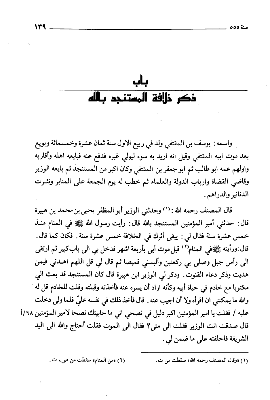 قال المصنف رحمه الله: [1] وحدثني الوزير أبو المظفر يحيى بن محمد بن هبيرة قال: حدثني أمير المؤمنين المستنجد باللَّه قَالَ: رَأَيْتُ رَسُولَ اللَّهِ صَلَّى اللَّهُ عَلَيْهِ وَسَلَّمَ في المنام منذ خمس عشرة سنة فقال لي: يبقى أثرك في الخلافة خمس عشرة سنة. فكان كما قال.