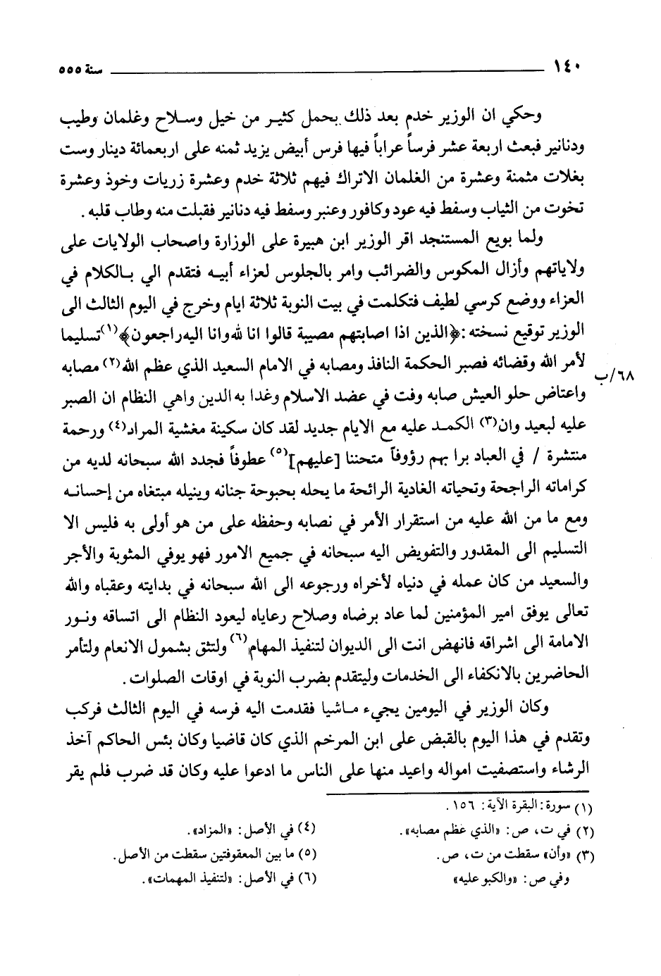 ولما بويع المستنجد أقر الوزير ابن هبيرة على الوزارة وأصحاب الولايات على ولاياتهم وأزال المكوس والضرائب وأمر بالجلوس لعزاء أبيه فتقدم إلي بالكلام في العزاء ووضع كرسي لطيف فتكلمت في بيت النوبة ثلاثة أيام وخرج في اليوم الثالث إلى الوزير توقيع نسخته: الَّذِينَ إِذا أَصابَتْهُمْ مُصِيبَةٌ قالُوا إِنَّا لِلَّهِ وَإِنَّا إِلَيْهِ راجِعُونَ 2: 156 [1] تسليما لأمر الله وقضائه فصبر الحكمة النافذ ومصابه في الإمام السعيد الذي عظم الله [2] مصابه واعتاض حلو العيش صابه وفت في عضد الإسلام وغدا به الدين واهي النظام ان الصبر عليه لبعيد وإن [3] الكمد عليه مع الأيام جديد لقد كان سكينة مغشية المراد [4] ورحمة منتشرة/ في العباد برا بهم رءوفا متحننا [عليهم] [5] عطوفا فجدد الله سبحانه لديه من كراماته الراجحة وتحياته الغادية الرائحة ما يحله بحبوحة جنانه وينيله مبتغاه من إحسانه ومع ما من الله عليه من استقرار الأمر في نصابه وحفظه على من هو أولى به فليس إلا التسليم إلى المقدور والتفويض إليه سبحانه في جميع الأمور فهو يوفي المثوبة والأجر والسعيد من كان عمله في دنياه لأخراه ورجوعه الى الله سبحانه في بدايته وعقباه والله تعالى يوفق أمير المؤمنين لما عاد برضاه وصلاح رعاياه ليعود النظام إلى اتساقه ونور الإمامة إلى إشراقه فانهض أنت إلى الديوان لتنفيذ المهام [6] ولتثق بشمول الإنعام ولتأمر الحاضرين بالانكفاء إلى الخدمات وليتقدم بضرب النوبة في أوقات الصلوات.