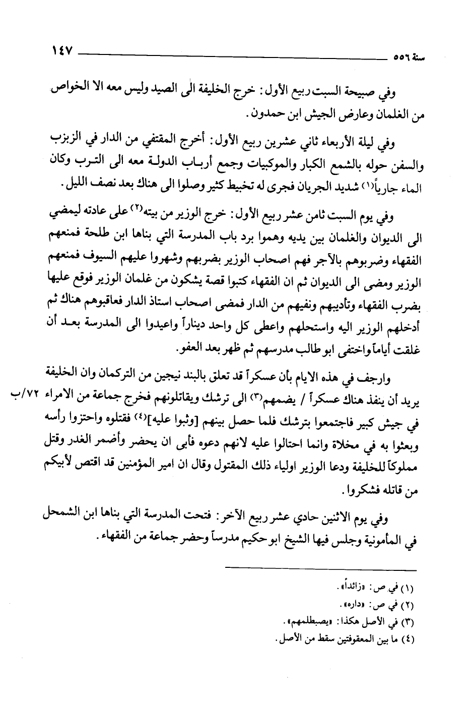 وفي يوم السبت ثامن عشر ربيع الأول: خرج الوزير من بيته [2] على عادته ليمضي إلى الديوان والغلمان بين يديه وهموا برد باب المدرسة التي بناها ابن طلحة فمنعهم الفقهاء وضربوهم بالآجر فهم أصحاب الوزير بضربهم وشهروا عليهم السيوف فمنعهم الوزير ومضى إلى الديوان ثم إن الفقهاء كتبوا قصة يشكون من غلمان الوزير فوقع عليها بضرب الفقهاء وتأديبهم ونفيهم من الدار فمضى أصحاب أستاذ الدار فعاقبوهم هناك ثم أدخلهم الوزير إليه واستحلهم وأعطى كل واحد دينارا وأعيدوا إلى المدرسة بعد أن غلقت أياما واختفى أبو طالب مدرسهم ثم ظهر بعد العفو.