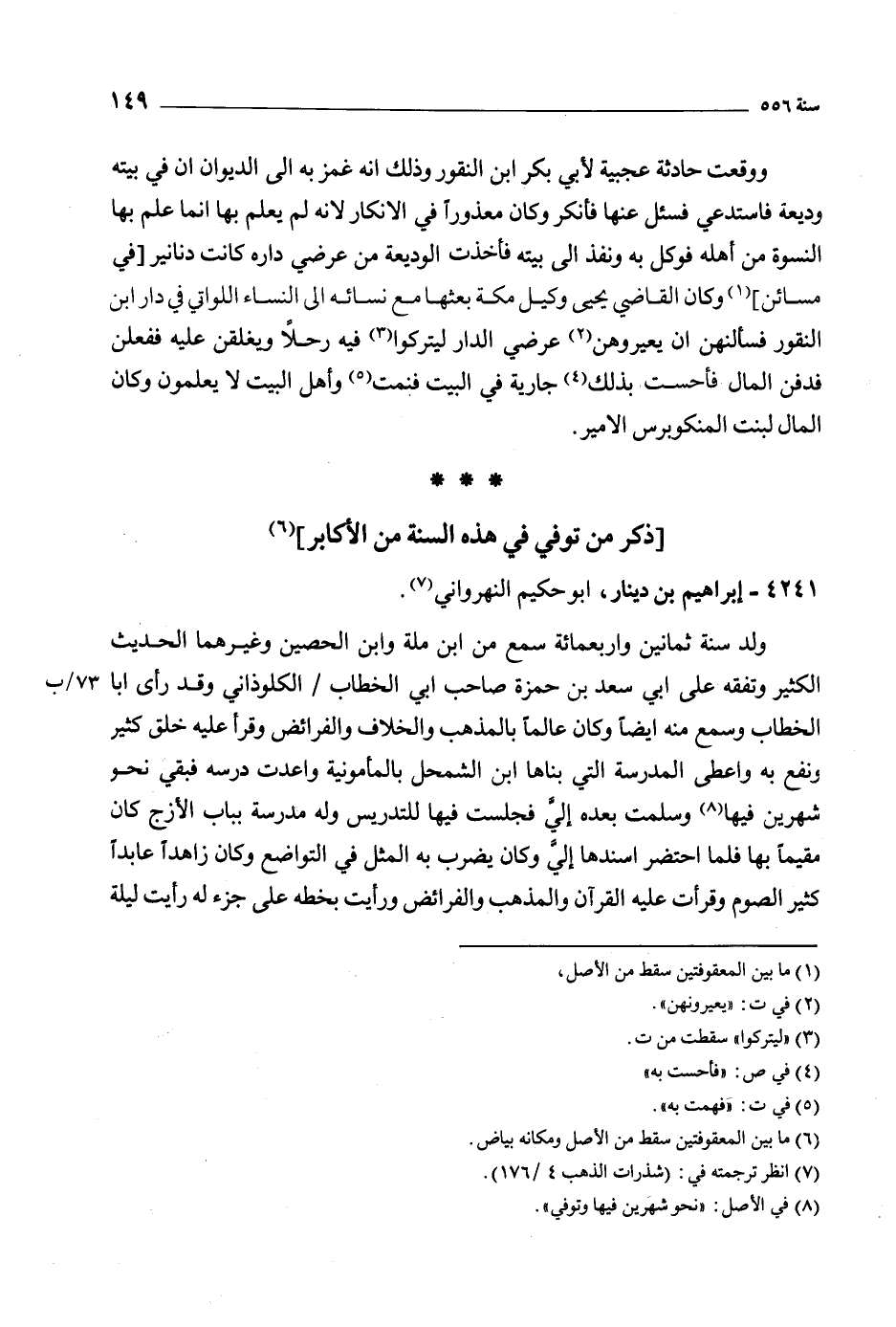 ووقعت حادثة عجيبة لأبي بكر ابن النقور وذلك أنه غمز به إلى الديوان أن في بيته وديعة فاستدعى فسئل عنها فأنكر وكان معذورا في الإنكار لانه لم يعلم بها إنما علم بها النسوة من أهله فوكل به ونفذ إلى بيته فأخذت الوديعة من عرضي داره كانت دنانير [في مسائن] [1] وكان القاضي يحيى وكيل مكة بعثها مع نسائه إلى النساء اللواتي في دار ابن النقور فسألنهن أن يعيروهن [2] عرضي الدار ليتركوا [3] فيه رحلا ويغلقن عليه ففعلن فدفن المال فأحست بذلك [4] جارية في البيت فنمت [5] وأهل البيت لا يعلمون وكان المال لبنت المنكوبرس الأمير.