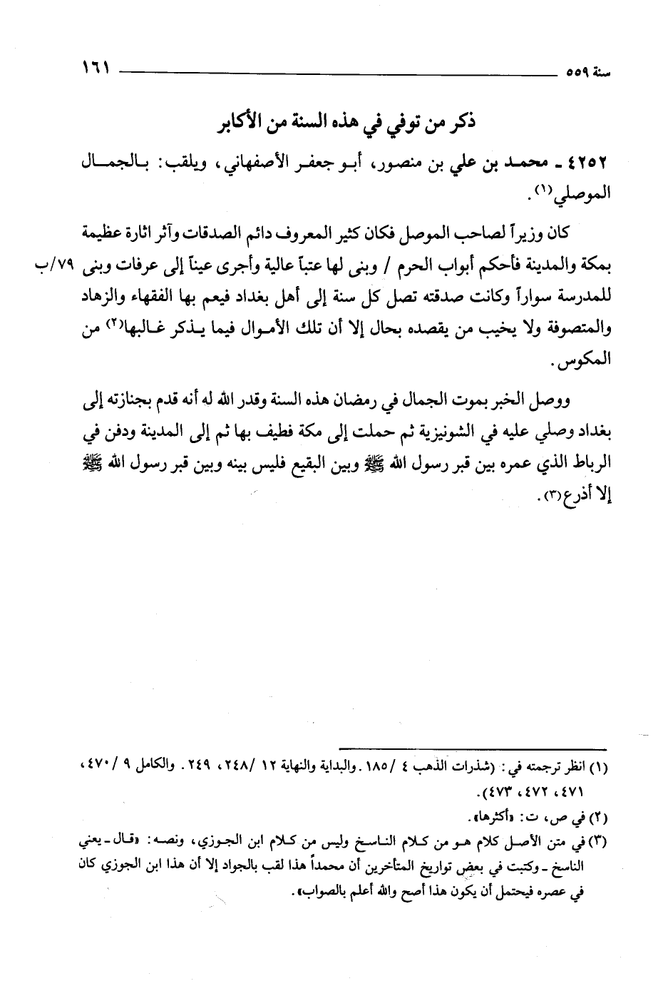 ووصل الخبر بموت الجمال في رمضان هذه السنة وقدر الله له أنه قدم بجنازته إلى بغداد وصلى عليه في الشونيزية ثم حملت إلى مكة فطيف بها ثم إلى المدينة ودفن في الرباط الذي عمره بين قَبْرِ رَسُولِ اللَّهِ صَلَّى اللَّهُ عَلَيْهِ وَسَلَّمَ وبين البقيع فليس بينه وبين قَبْرِ رَسُولِ اللَّهِ صَلَّى اللَّهُ عَلَيْهِ وَسَلَّمَ إلا أذرع [3] .
