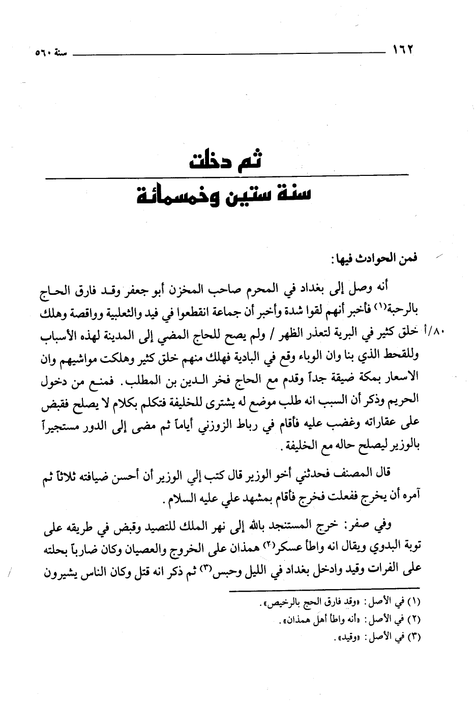 أنه وصل إلى بغداد في المحرم صاحب المخزن أبو جعفر وقد فارق الحاج بالرحبة [1] فأخبر أنهم لقوا شدة وأخبر أن جماعة انقطعوا في فيد والثعلبية وواقصة وهلك 80/ أخلق كثير في البرية لتعذر الظهر/ ولم يصح للحاج المضي إلى المدينة لهذه الأسباب وللقحط الذي بنا وأن الوباء وقع في البادية فهلك منهم خلق كثير وهلكت مواشيهم وأن الأسعار بمكة ضيقة جدا وقدم مع الحاج فخر الدين بن المطلب. فمنع من دخول الحريم وذكر أن السبب أنه طلب موضع له يشتري للخليفة فتكلم بكلام لا يصلح فقبض على عقاراته وغضب عليه فأقام في رباط الزوزني أياما ثم مضى إلى الدور مستجيرا بالوزير ليصلح حاله مع الخليفة.