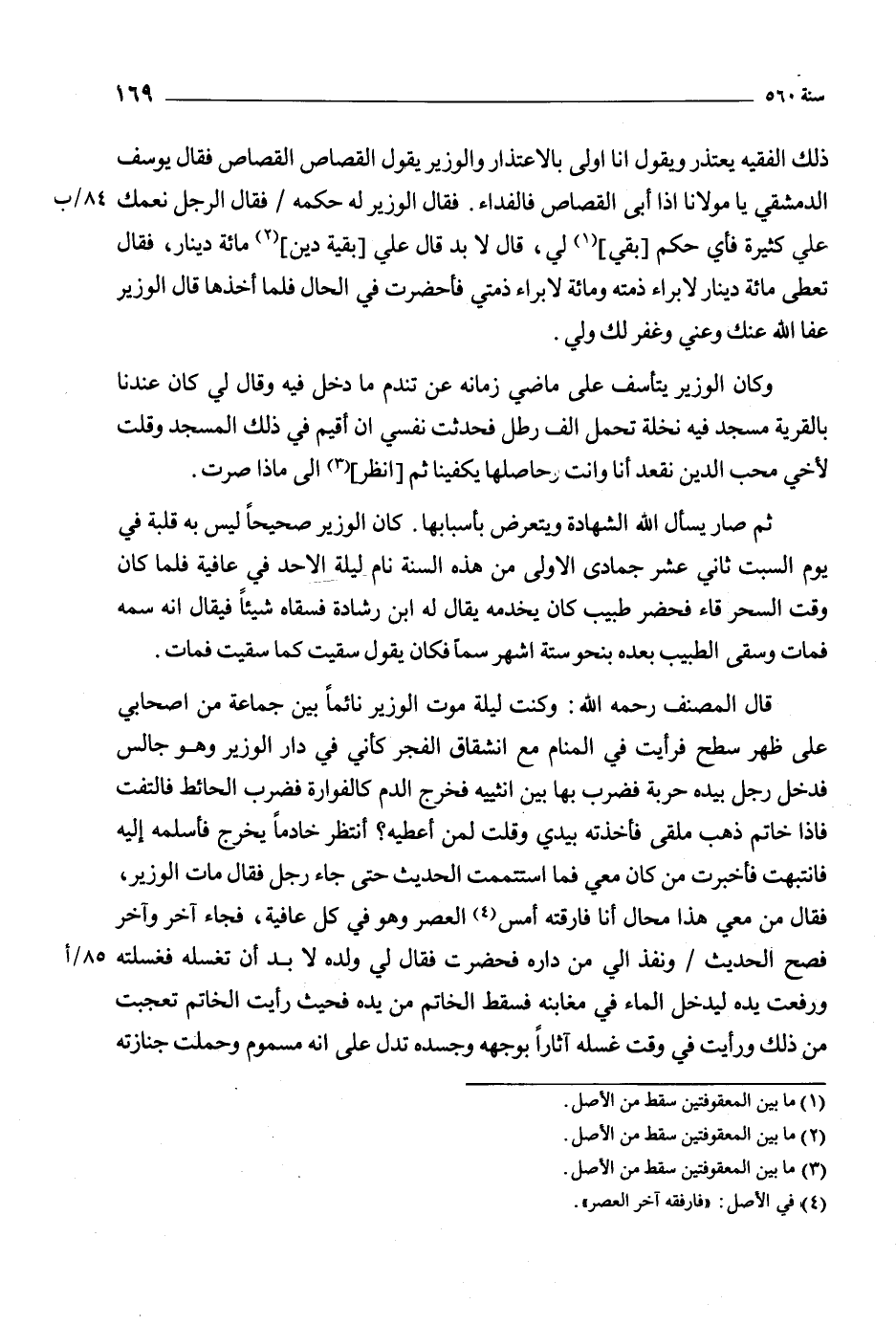 قال المصنف رحمه الله: وكنت ليلة موت الوزير نائما بين جماعة من أصحابي على ظهر سطح فرأيت في المنام مع انشقاق الفجر كأني في دار الوزير وهو جالس فدخل رجل بيده حربة فضرب بها بين أنثييه فخرج الدم كالفوارة فضرب الحائط فالتفت فإذا خاتم ذهب ملقى فأخذته بيدي وقلت لمن أعطيه؟ أنتظر خادما يخرج فأسلمه إليه فانتبهت فأخبرت من كان معي فما استتممت الحديث حتى جاء رجل فقال مات الوزير، فقال من معي هذا محال أنا فارقته أمس [4] العصر وهو في كل عافية، فجاء آخر وآخر فصح الحديث/ ونفذ إلى من داره فحضرت فقال لي ولده لا بد أن تغسله فغسلته 85/ أورفعت يده ليدخل الماء في مغابنه فسقط الخاتم من يده فحيث رأيت الخاتم تعجبت من ذلك ورأيت في وقت غسله آثارا بوجهه وجسده تدل على أنه مسموم وحملت جنازته