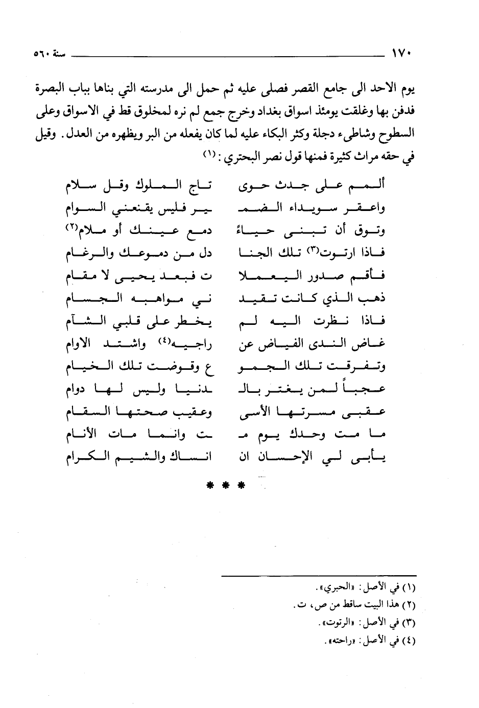يوم الأحد إلى جامع القصر فصلى عليه ثم حمل إلى مدرسته التي بناها بباب البصرة فدفن بها وغلقت يومئذ أسواق بغداد وخرج جمع لم نره لمخلوق قط في الأسواق وعلى السطوح وشاطئ دجلة وكثر البكاء عليه لما كان يفعله من البر ويظهره من العدل. وقيل في حقه مراث كثيرة فمنها قول نصر البحتري: [1]