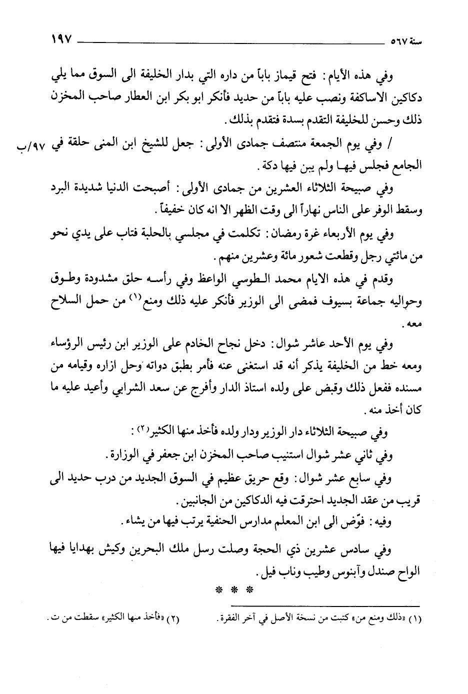 وفي هذه الأيام: فتح قيماز بابا من داره التي بدار الخليفة إلى السوق مما يلي دكاكين الأساكفة ونصب عليه بابا من حديد فأنكر أبو بكر ابن العطار صاحب المخزن ذلك وحسن للخليفة التقدم بسده فتقدم بذلك.