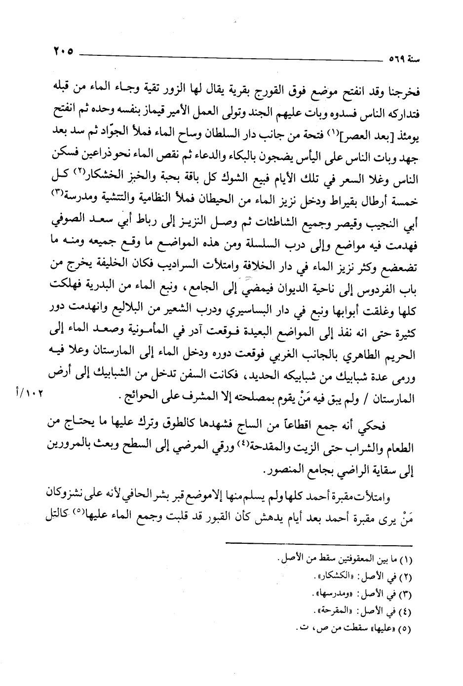 فخرجنا وقد انفتح موضع فوق القورج بقرية يقال لها الزور تقية وجاء الماء من قبله فتداركه الناس فسدوه وبات عليهم الجند وتولى العمل الأمير قيماز بنفسه وحده ثم انفتح يومئذ [بعد العصر] [1] فتحة من جانب دار السلطان وساح الماء فملأ الجواد ثم سد بعد جهد وبات الناس على اليأس يضجون بالبكاء والدعاء ثم نقص الماء نحو ذراعين فسكن الناس وغلا السعر في تلك الأيام فبيع الشوك كل باقة بحبة والخبز الخشكار [2] كل خمسة أرطال بقيراط ودخل نزيز الماء من الحيطان فملأ النظامية والتتشية ومدرسة [3] أبي النجيب وقيصر وجميع الشاطئات ثم وصل النزيز إلى رباط أبي سعد الصوفي فهدمت فيه مواضع والى درب السلسلة ومن هذه المواضع ما وقع جميعه ومنه ما تضعضع وكثر نزيز الماء في دار الخلافة وامتلأت السراديب فكان الخليفة يخرج من باب الفردوس إلى ناحية الديوان فيمضي إلى الجامع، ونبع الماء من البدرية فهلكت كلها وغلقت أبوابها ونبع في دار البساسيري ودرب الشعير من البلاليع وانهدمت دور كثيرة حتى أنه نفذ إلى المواضع البعيدة فوقعت آدر في المأمونية وصعد الماء إلى الحريم الطاهري بالجانب الغربي فوقعت دوره ودخل الماء إلى المارستان وعلا فيه ورمى عدة شبابيك من شبابيكه الحديد، فكانت السفن تدخل من الشبابيك إلى أرض المارستان/ ولم يبق فيه من يقوم بمصلحته إلا المشرف على الحوائج. 102/ أفحكي أنه جمع اقطاعا من الساج فشهدها كالطوق وترك عليها ما يحتاج من الطعام والشراب حتى الزيت والمقدحة [4] ورقي المرضى إلى السطح وبعث بالمرورين إلى سقاية الراضي بجامع المنصور.