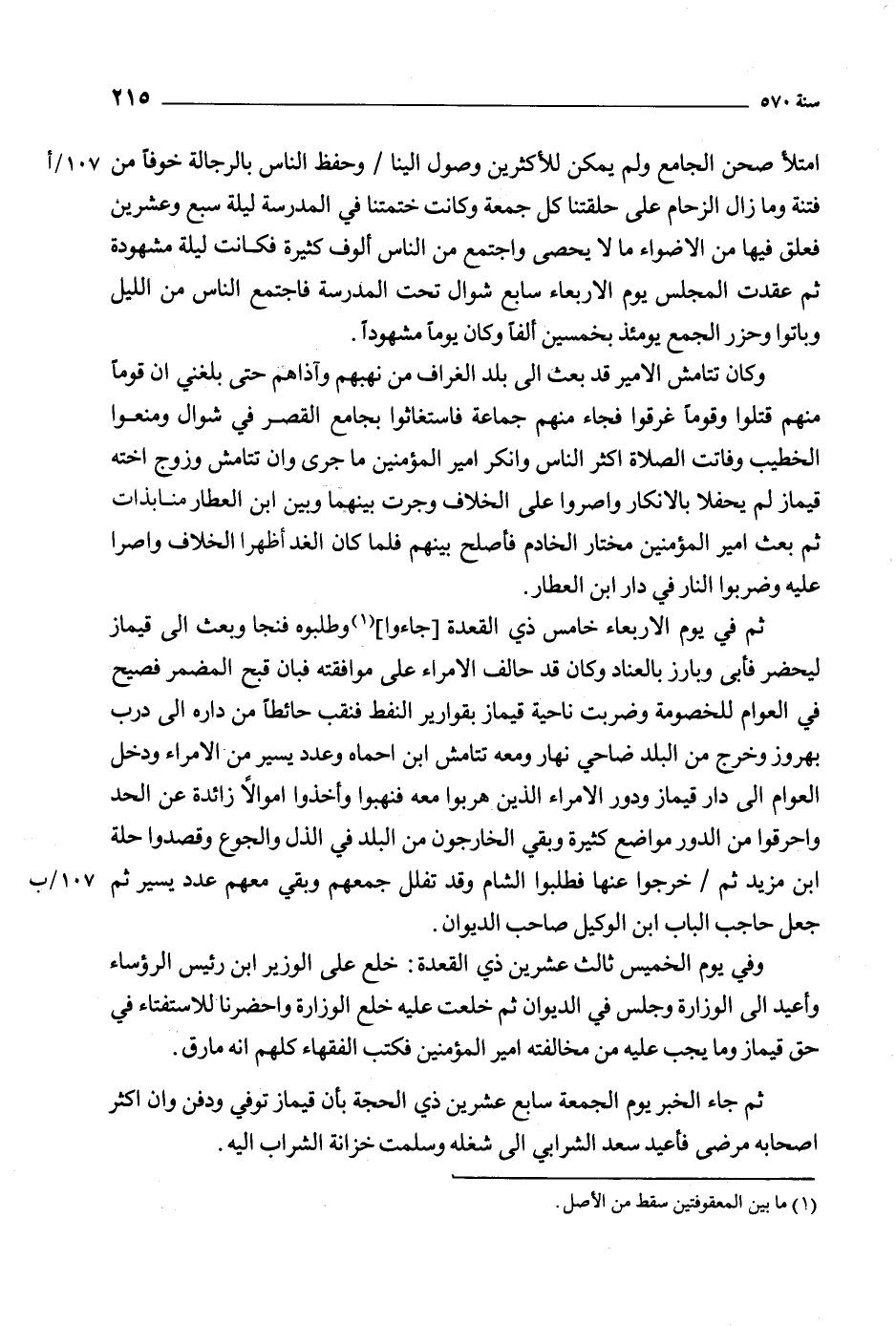 ثم في يوم الأربعاء خامس ذي القعدة [جاءوا] [1] وطلبوه فنجا وبعث إلى قيماز ليحضر فأبى وبارز بالعناد وكان قد حالف الأمراء على موافقته فبان قبح المضمر فصيح في العوام للخصومة وضربت ناحية قيماز بقوارير النفط فنقب حائطا من داره إلى درب بهروز وخرج من البلد ضاحي نهار ومعه تتامش ابن احماه وعدد يسير من الأمراء ودخل العوام إلى دار قيماز ودور الأمراء الذين هربوا معه فنهبوا وأخذوا أموالا زائدة عن الحد واحرقوا من الدور مواضع كثيرة وبقي الخارجون من البلد في الذل والجوع وقصدوا حلة ابن مزيد ثم/ خرجوا عنها فطلبوا الشام وق تفلل جمعهم وبقي معهم عدد يسير ثم 107/ ب جعل حاجب الباب ابن الوكيل صاحب الديوان.