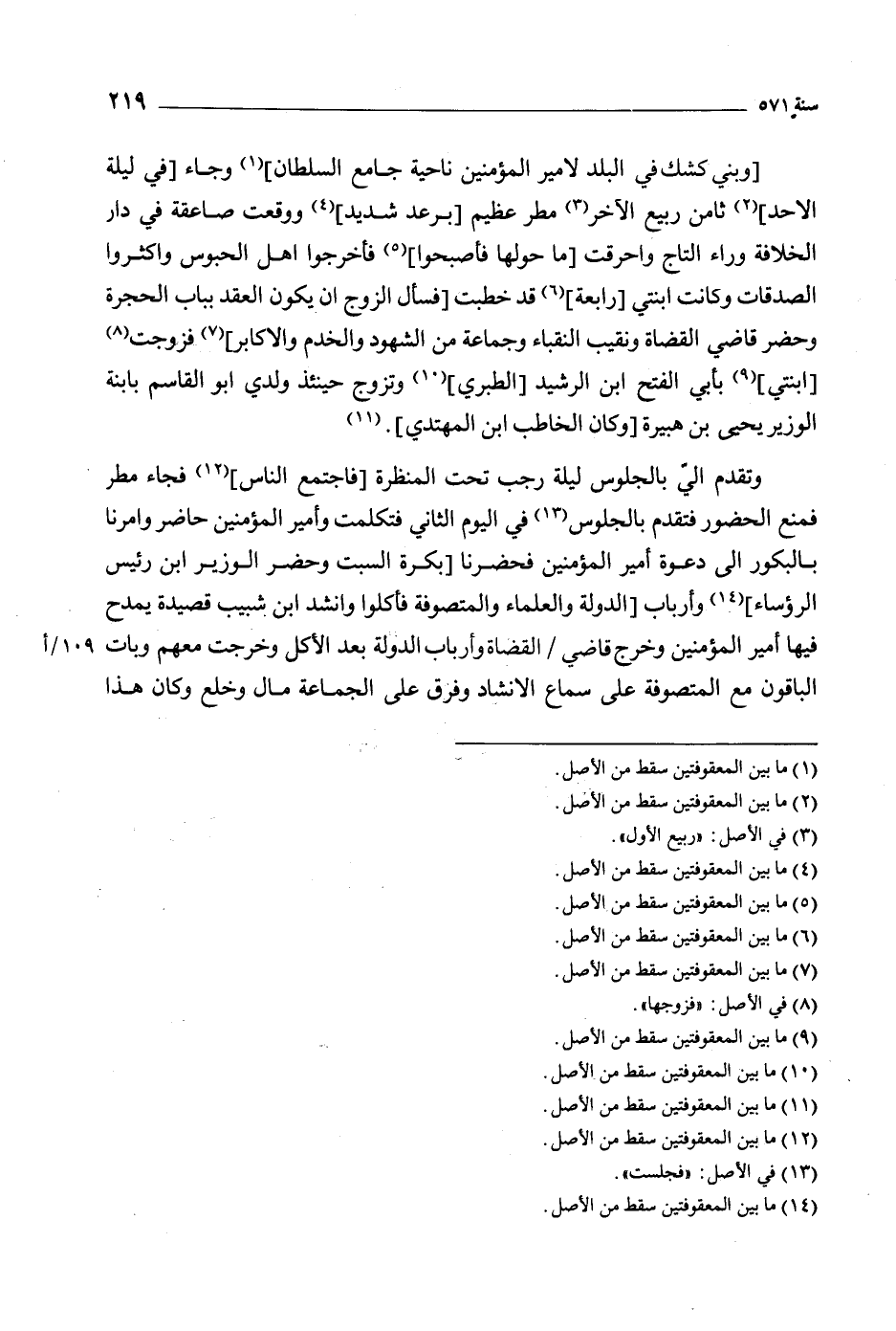 [وبنى كشك في البلد لأمير المؤمنين ناحية جامع السلطان] [1] وجاء [في ليلة الأحد] [2] ثامن ربيع الآخر [3] مطر عظيم [برعد شديد] [4] ووقعت صاعقة في دار الخلافة وراء التاج وأحرقت [ما حولها فأصبحوا] [5] فأخرجوا أهل الحبوس وأكثروا الصدقات وكانت ابنتي [رابعة] [6] قد خطبت [فسأل الزوج أن يكون العقد بباب الحجرة وحضر قاضي القضاة ونقيب النقباء وجماعة من الشهود والخدم والأكابر] [7] فزوجت [8] [ابنتي] [9] بأبي الفتح ابن الرشيد [الطبري] [10] وتزوج حينئذ ولدي أبو القاسم بابنة الوزير يحيى بن هبيرة [وكان الخاطب ابن المهتدي] . [11] وتقدم إلي بالجلوس ليلة رجب تحت المنظرة [فاجتمع الناس] [12] فجاء مطر فمنع الحضور فتقدم بالجلوس [13] في اليوم الثاني فتكلمت وأمير المؤمنين حاضر وأمرنا بالبكور إلى دعوة أمير المؤمنين فحضرنا [بكرة السبت وحضر الوزير ابن رئيس الرؤساء] [14] وأرباب [الدولة والعلماء والمتصوفة فأكلوا وأنشد ابن شبيب قصيدة يمدح فيها أمير المؤمنين وخرج قاضي/ القضاة وأرباب الدولة بعد الأكل وخرجت معهم وباب 109/ أالباقون مع المتصوفة على سماع الإنشاد وفرق على الجماعة مال وخلع وكان هذا
