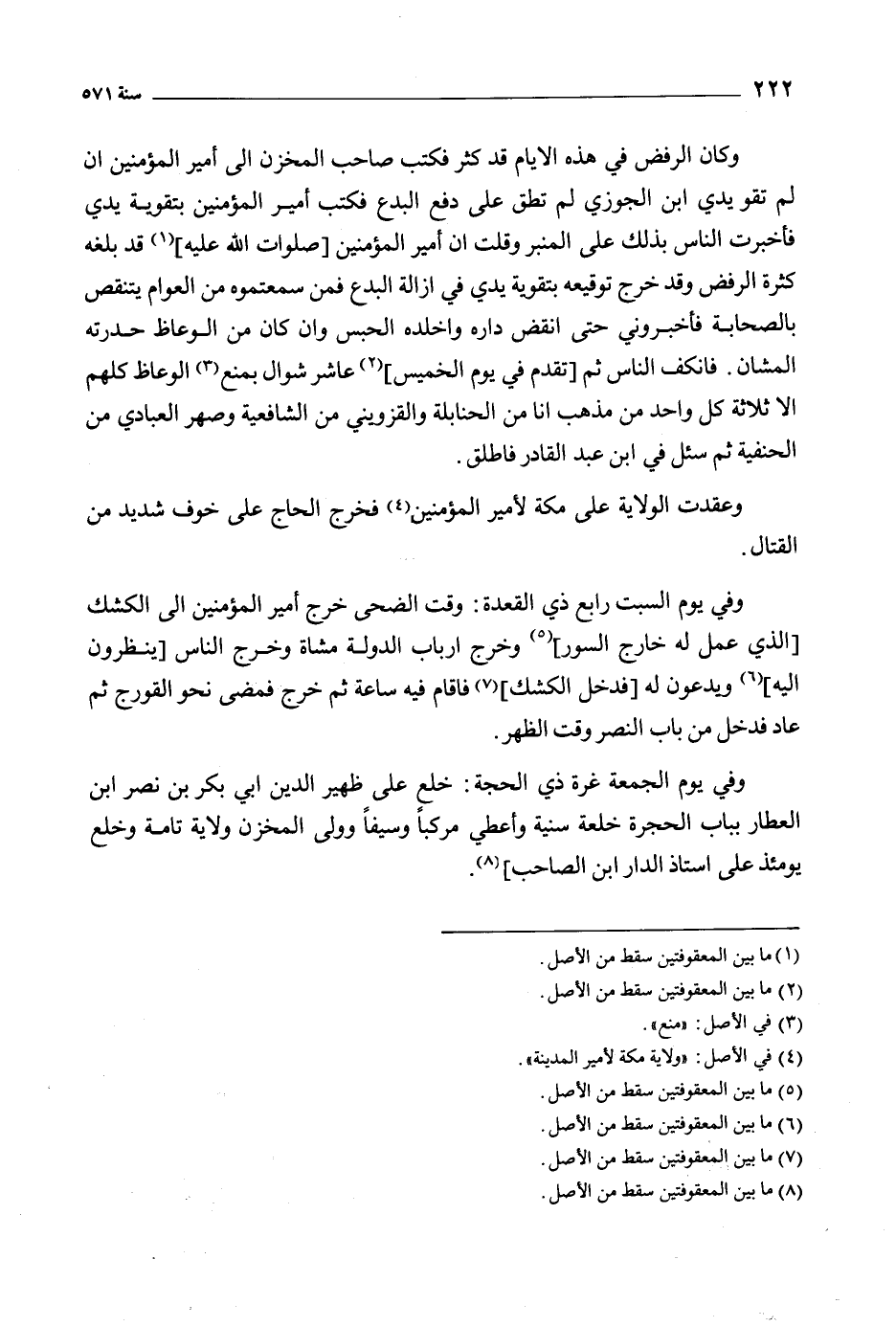 وكان الرفض في هذه الأيام قد كثر فكتب صاحب المخزن إلى أمير المؤمنين أن لم تقو يدي ابن الجوزي لم تطق على دفع البدع فكتب أمير المؤمنين بتقوية يدي فأخبرت الناس بذلك على المنبر وقلت إن أمير المؤمنين [صلوات الله عليه] [1] قد بلغه كثرة الرفض وقد خرج توقيعه بتقوية يدي في إزالة البدع فمن سمعتموه من العوام يتنقص بالصحابة فأخبروني حتى انقض داره وأخلده الحبس وإن كان من الوعاظ حدرته المشان. فانكف الناس ثم [تقدم في يوم الخميس] [2] عاشر شوال بمنع [3] الوعاظ كلهم إلا ثلاثة كل واحد من مذهب أنا من الحنابلة والقزويني من الشافعية وصهر العبادي من الحنفية ثم سئل في ابن عبد القادر فاطلق.