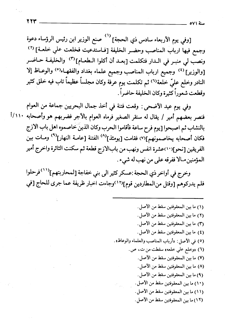 [وفي يوم الأربعاء سادس ذي الحجة] [1] صنع الوزير ابن رئيس الرؤساء دعوة وجمع فيها أرباب المناصب وحضر الخليفة [فاستدعيت فخلعت على خلعة] [2] ونصب لي منبر في الدار فتكلمت [بعد أن أكلوا الطعام] [3] والخليفة حاضر [والوزير] [4] وجميع أرباب المناصب وجميع علماء بغداد والفقهاء [5] والوعاظ إلا النادر وخلع عليّ خلعة [6] ثم تكلمت يوم عرفة وكان مجلسا عظيما تاب فيه خلق كثير وقطعت شعورا كثيرة وكان الخليفة حاضرا.