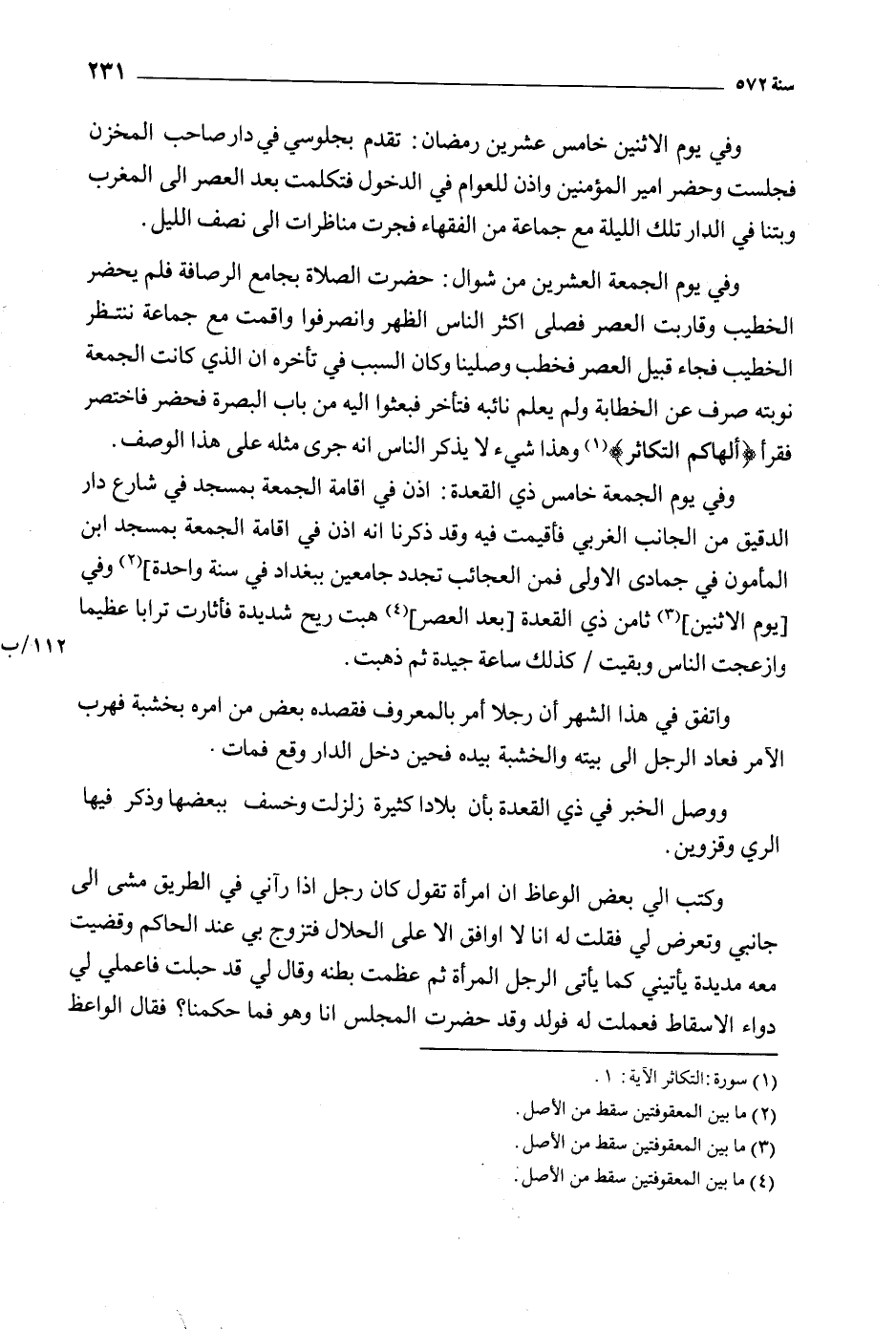 وفي يوم الجمعة العشرين من شوال: حضرت الصلاة بجامع الرصافة فلم يحضر الخطيب وقاربت العصر فصلى أكثر الناس الظهر وانصرفوا وأقمت مع جماعة ننتظر الخطيب فجاء قبيل العصر فخطب وصلينا وكان السبب في تأخره ان الذي كانت الجمعة نوبته صرف عن الخطابة ولم يعلم نائبه فتأخر فبعثوا إليه من باب البصرة فحضر فاختصر فقرأ أَلْهاكُمُ التَّكاثُرُ 102: 1 [1] وهذا شيء لا يذكر الناس أنه جرى مثله على هذا الوصف.