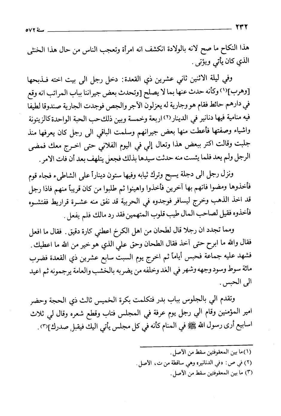وفي ليلة الاثنين ثاني عشرين ذي القعدة: دخل رجل إلى بيت أخته فذبحها [وهرب] [1] وكأنه حدث عنها بما لا يصلح [وتحدث بعض جيراننا بباب المراتب انه وقع في دارهم حائط فقام هو وجارية له يعزلون الآجر والجص فوجدت الجارية صندوقا لطيفا فيه منامية فيها دنانير في الدينار [2] أربعة وخمسة وبين ذلك حب الحبة الواحدة كالزيتونة وأشياء وصفتها فأعطت منها بعض جيرانهم وسلمت الباقي إلى رجل كان يعرفها منذ جلبت وقالت اكتر ببعض هذا وتعال إلي في اليوم الفلاني حتى أخرج معك فمضى الرجل ولم يعد فلما يئست منه حدثت سيدها بذلك فجعل يتلهف بعد أن فات الأمر.
