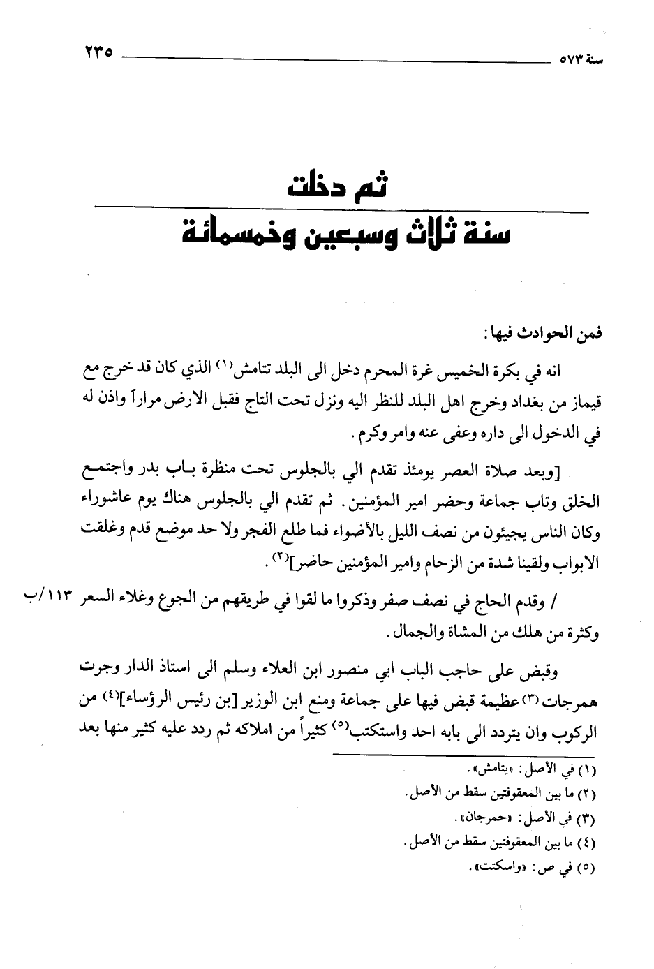أنه في بكرة الخميس غرة المحرم دخل إلى البلد تتامش [1] الذي كان قد خرج مع قيماز من بغداد وخرج أهل البلد للنظر إليه ونزل تحت التاج فقبل الأرض مرارا وأذن له في الدخول إلى داره وعفي عنه وأمر وكرم.
