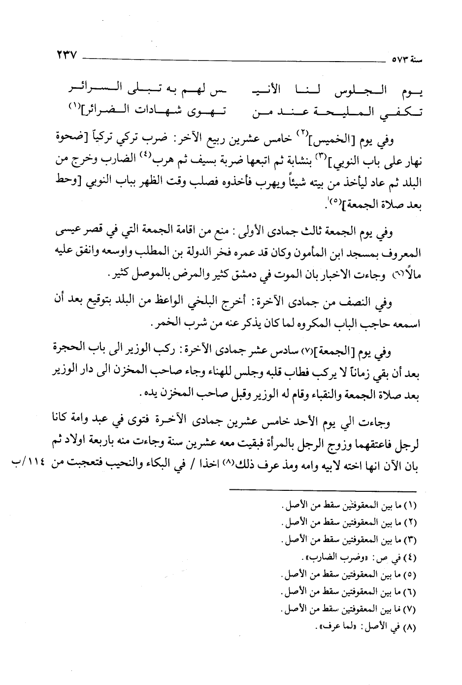 [1] وفي يوم [الخميس] [2] خامس عشرين ربيع الآخر: ضرب تركي تركيا [ضحوة نهار على باب النوبي] [3] بنشابة ثم اتبعها ضربة بسيف ثم هرب [4] الضارب وخرج من البلد ثم عاد ليأخذ من بيته شيئا ويهرب فأخذوه فصلب وقت الظهر بباب النوبي [وحط بعد صلاة الجمعة] [5] .