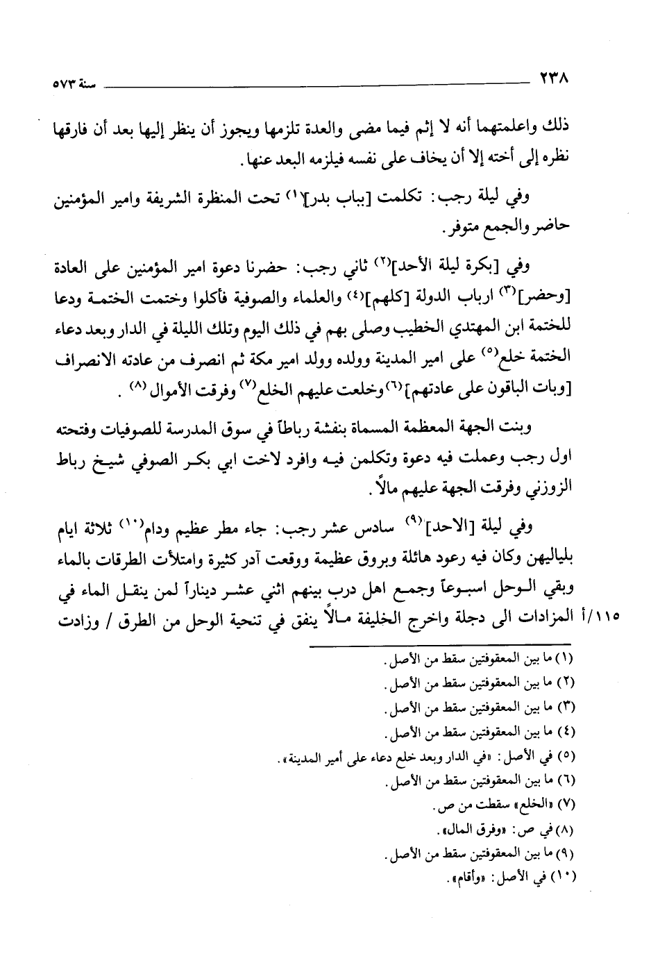 وفي ليلة [الأحد] [9] سادس عشر رجب: جاء مطر عظيم ودام [10] ثلاثة أيام بلياليهن وكان فيه رعود هائلة وبروق عظيمة ووقعت آدر كثيرة وامتلأت الطرقات بالماء وبقي الوحل أسبوعا وجمع أهل درب بينهم اثني عشر دينارا لمن ينقل الماء في 115/ أالمزادات إلى دجلة وأخرج الخليفة مالا ينفق في تنحية الوحل من الطرق/ وزادت