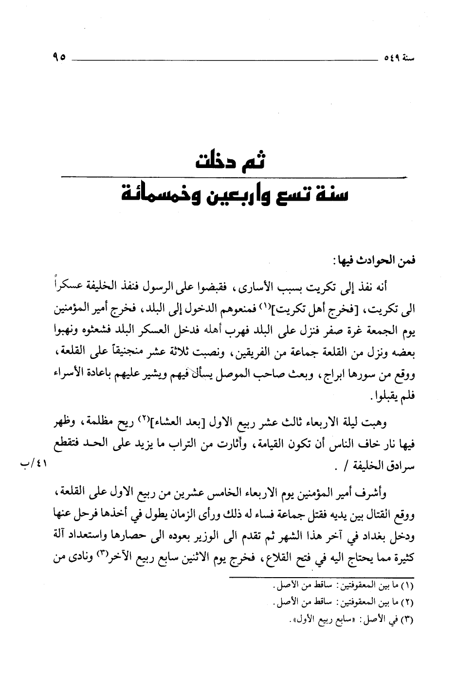 أنه نفذ إلى تكريت بسبب الأسارى، فقبضوا على الرسول فنفذ الخليفة عسكرا إلى تكريت، [فخرج أهل تكريت] [1] فمنعوهم الدخول إلى البلد، فخرج أمير المؤمنين يوم الجمعة غرة صفر فنزل على البلد فهرب أهله فدخل العسكر البلد فشعثوه ونهبوا بعضه ونزل من القلعة جماعة من الفريقين، ونصبت ثلاثة عشر منجنيقا على القلعة، ووقع من سورها أبراج، وبعث صاحب الموصل يسأل فيهم ويشير عليهم بإعادة الأسراء فلم يقبلوا.