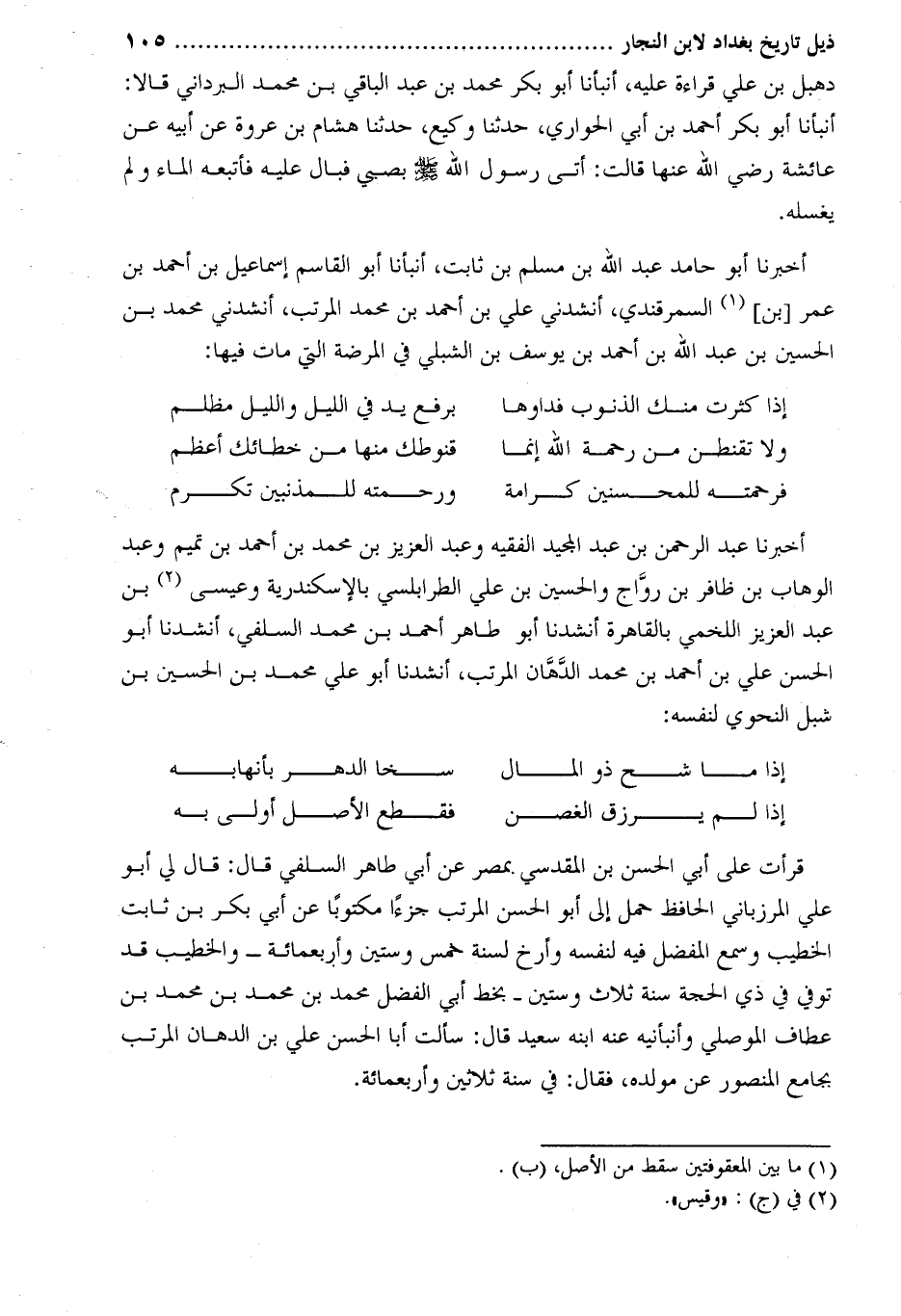 أخبرنا عبد الرحمن بن عبد المجيد الفقيه وعَبْد العزيز بْن مُحَمَّد بْن أَحْمَد بْن تميم وعبد الوهاب بن ظافر بن رواج والحسين بن علي الطرابلسي بالإسكندرية وعيسى [2] بن عبد العزيز اللخمي بالقاهرة أنشدنا أبو طاهر أَحْمَد بن مُحَمَّد السلفي، أنشدنا أَبُو الْحَسَنِ عَلِيُّ بْنُ أَحْمَدَ بْنِ مُحَمَّدِ الدهان المرتب، أنشدنا أبو علي مُحَمَّد بن الحسين بن شبل النحوي لنفسه: